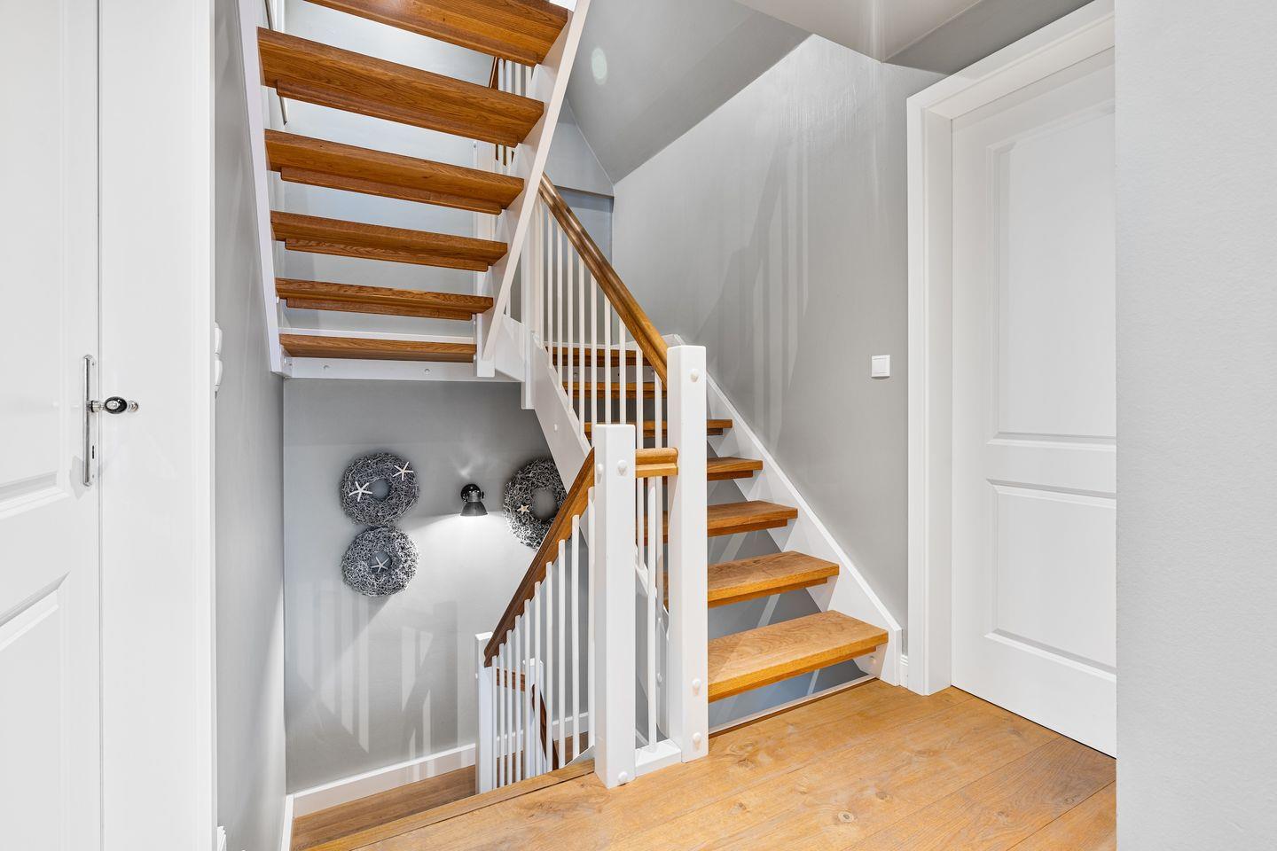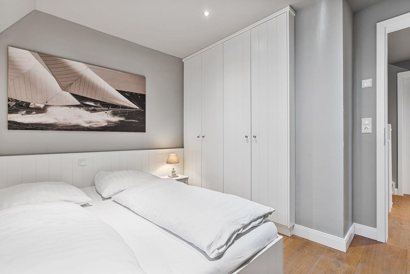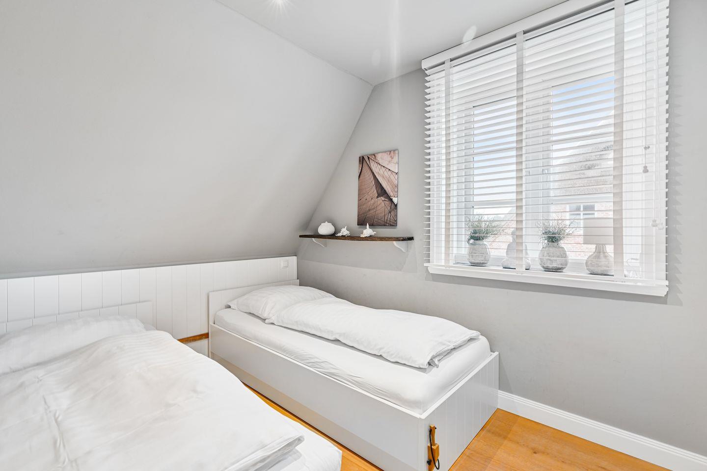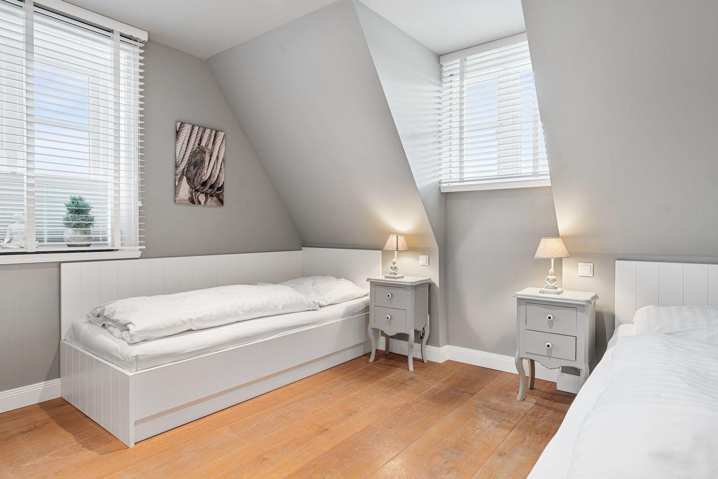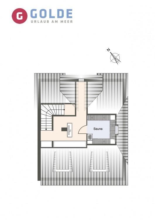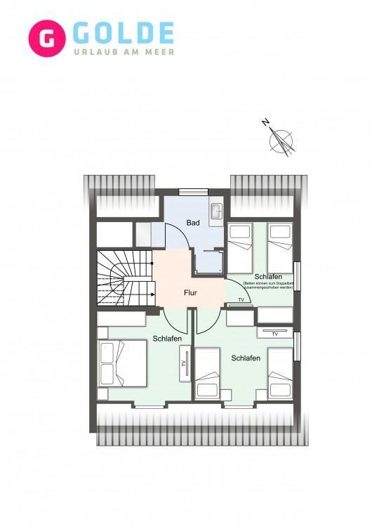 Über eine Holztreppe gelangt man in das mit Parkett ausgelegte Obergeschoss. Dieses verfügt ebenfalls über eine Fußbodenheizung. Ebenfalls drei Schlafzimmer, Schlafzimmer I mit einem Doppelbett 1,80 x 2,00 m, Schlafzimmer II mit 2 Einzelbetten und Schlafzimmer 3 mit 2 Einzelbetten die zu einem Doppelbett zusammengeschoben werden können, jeweils mit TV ausgestattet. Einbauschränke gewähren Ihnen hinreichend Ablageflächen. Darüber hinaus befindet sich im Obergeschoss ein weiteres Bad mit Dusche. Vom Obergeschoss führt die Holztreppe hinauf in das Dachgeschoss. Hier befindet sich eine sehr große Sauna mit Entspannungsbereich. Dieses wunderschöne Haus lässt keine Wünsche offen und bringt Sie sofort in Urlaubsstimmung.