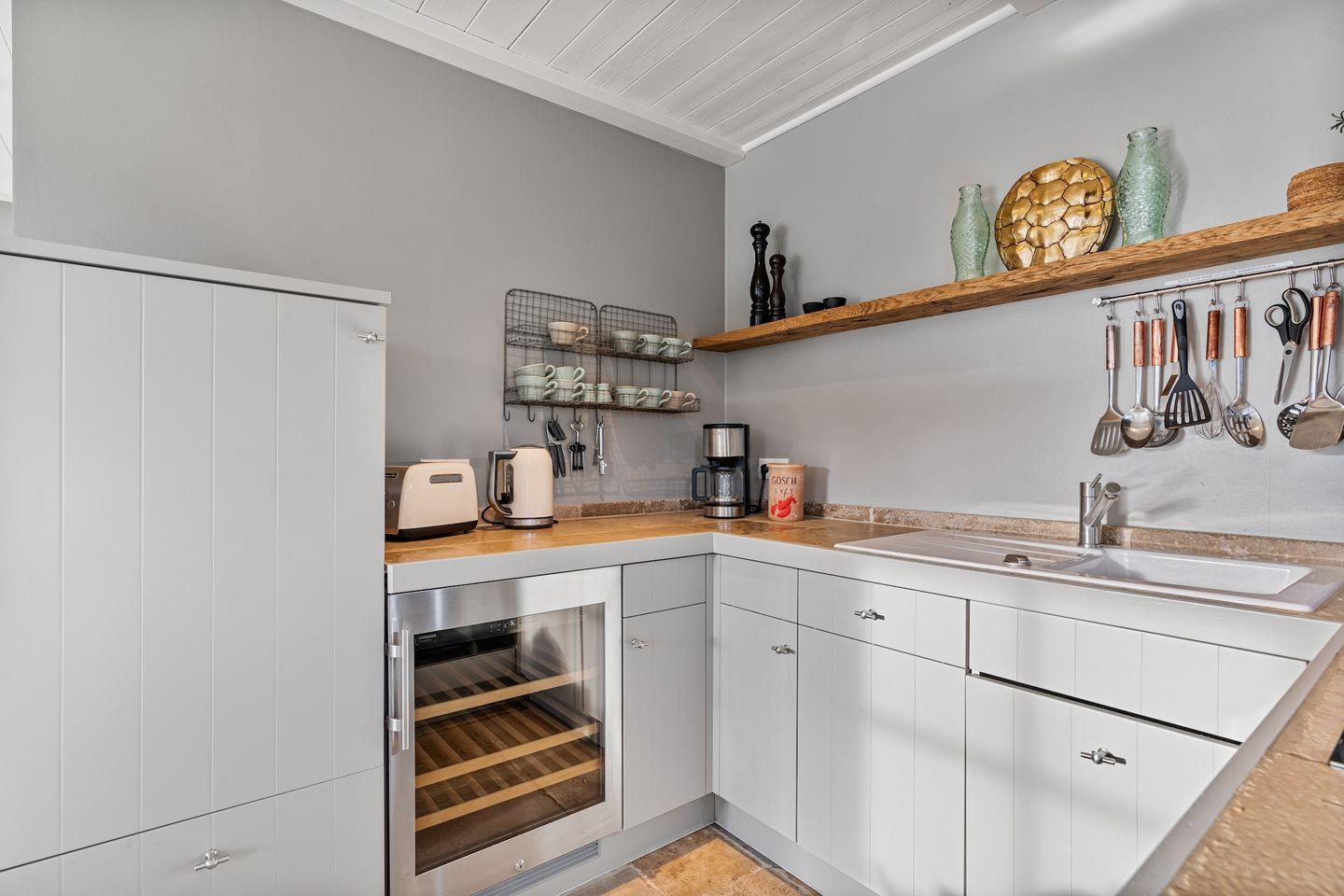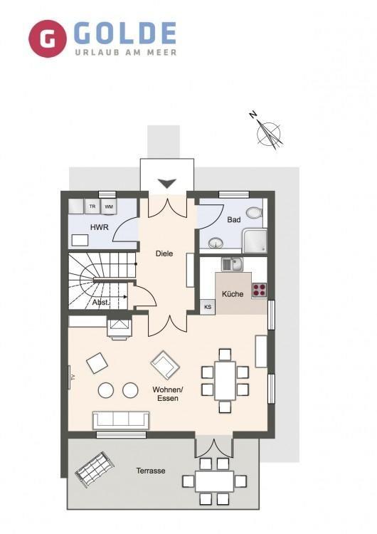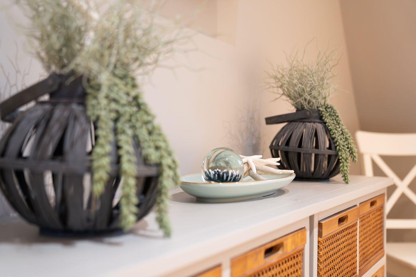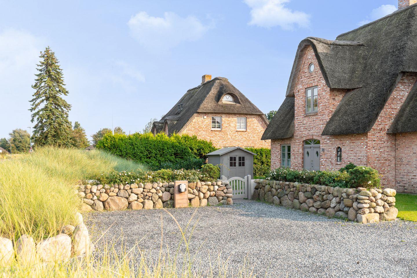 Die luxuriöse Haushälfte unter Reet verfügt über ca. 105 m² Wohnfläche und bietet Platz für 6 Personen. Im Erdgeschoss befindet sich der lichtdurchflutete Wohnraum mit TV, Kamin, einer offenen Küche sowie einem stilvollen Essbereich. Die Wohnräume sind mit wunderschönen Möbeln ausgestattet. Die Küche verfügt über hochwertige Elektrogeräte. An den Wohnbereich schließen sich ein Flur mit ein Hauswirtschaftsraum und ein Duschbad an. Das gesamte Erdgeschoss verfügt über geschmackvolle Natursteinfliesen, die über eine Fußbodenheizung beheizt werden können.