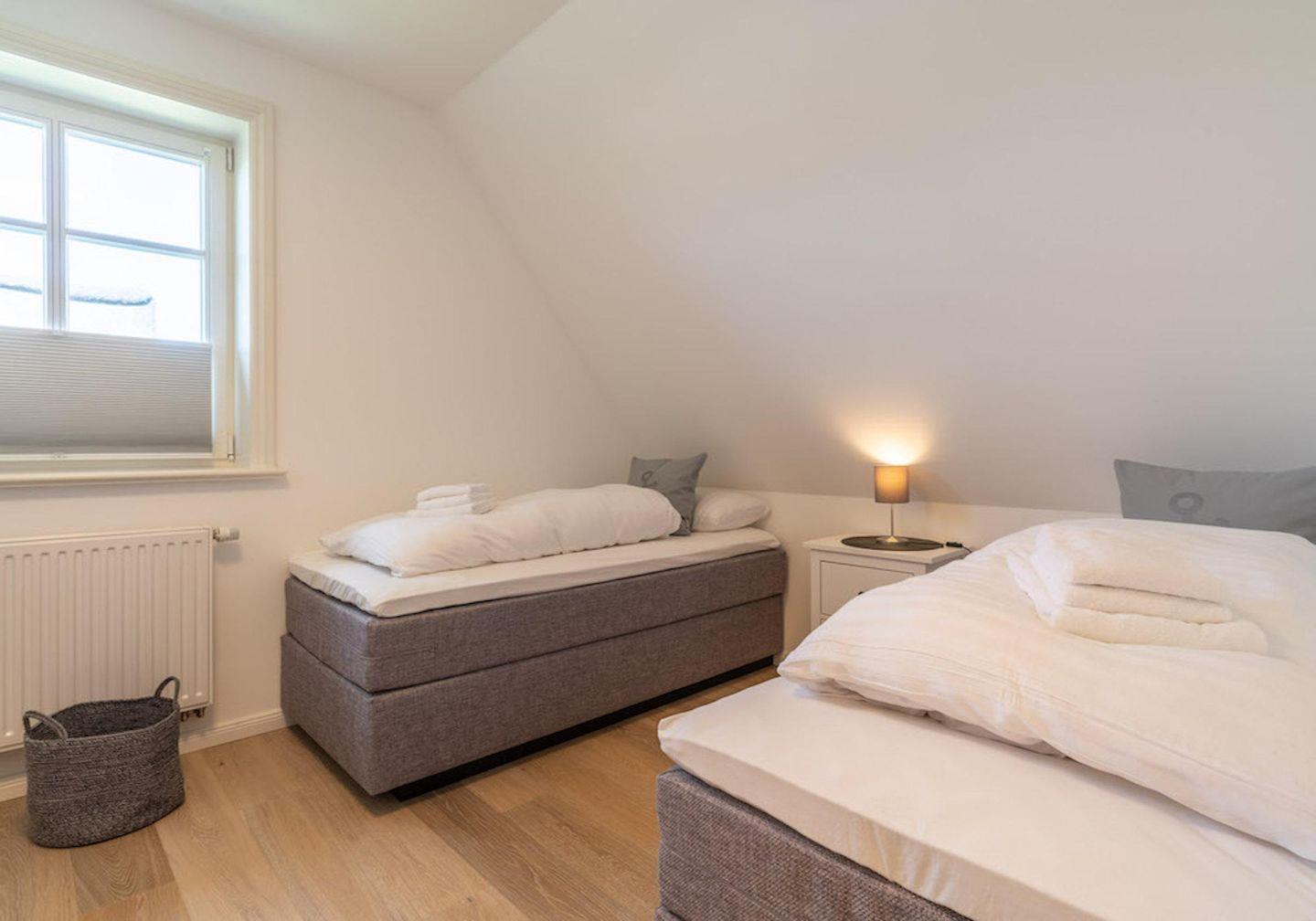 Über eine Holztreppe gelangt man in das ebenso mit Parkett ausgelegte Obergeschoss. Die beiden Schlafzimmer, eines mit einem Doppelboxspringbett und ein weiteres mit 2 Einzelboxspringbetten sorgen für ruhevolle Erholung.