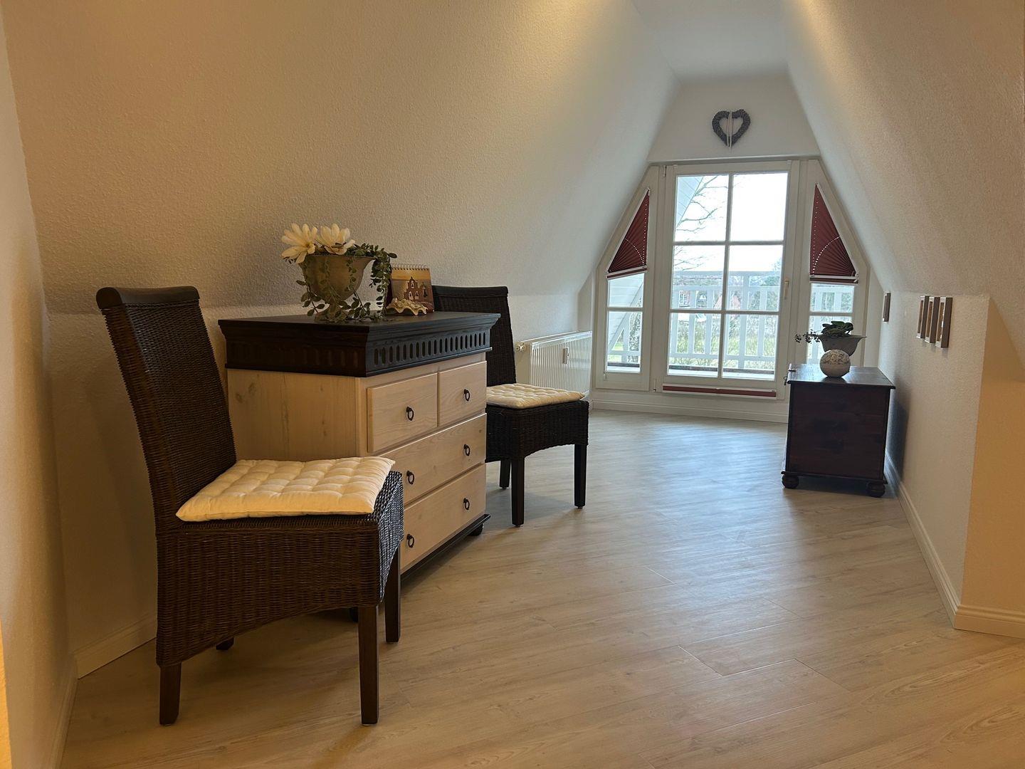 Der lichtdurchflutete Wohnraum mit TV, Sofalonge und einem gemütlichen Essbereich bietet jeden Komfort. Die Küche mit hochwertigen Geräten, grenzt direkt am Wohnzimmer an. Zwei Bäder, eines mit Dusche und das andere mit Badewanne, bieten genügend Platz für Ihre Utensilien. Die beiden Schlafzimmer im Dachgeschoss mit 180er Doppelbett, sowie 2 Einzelbetten sorgen für ruhevolle Erholung.