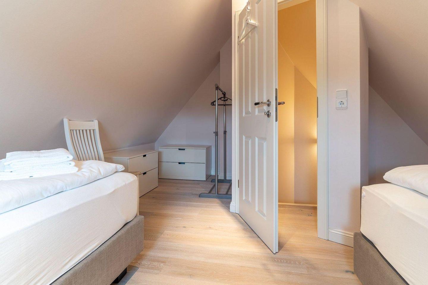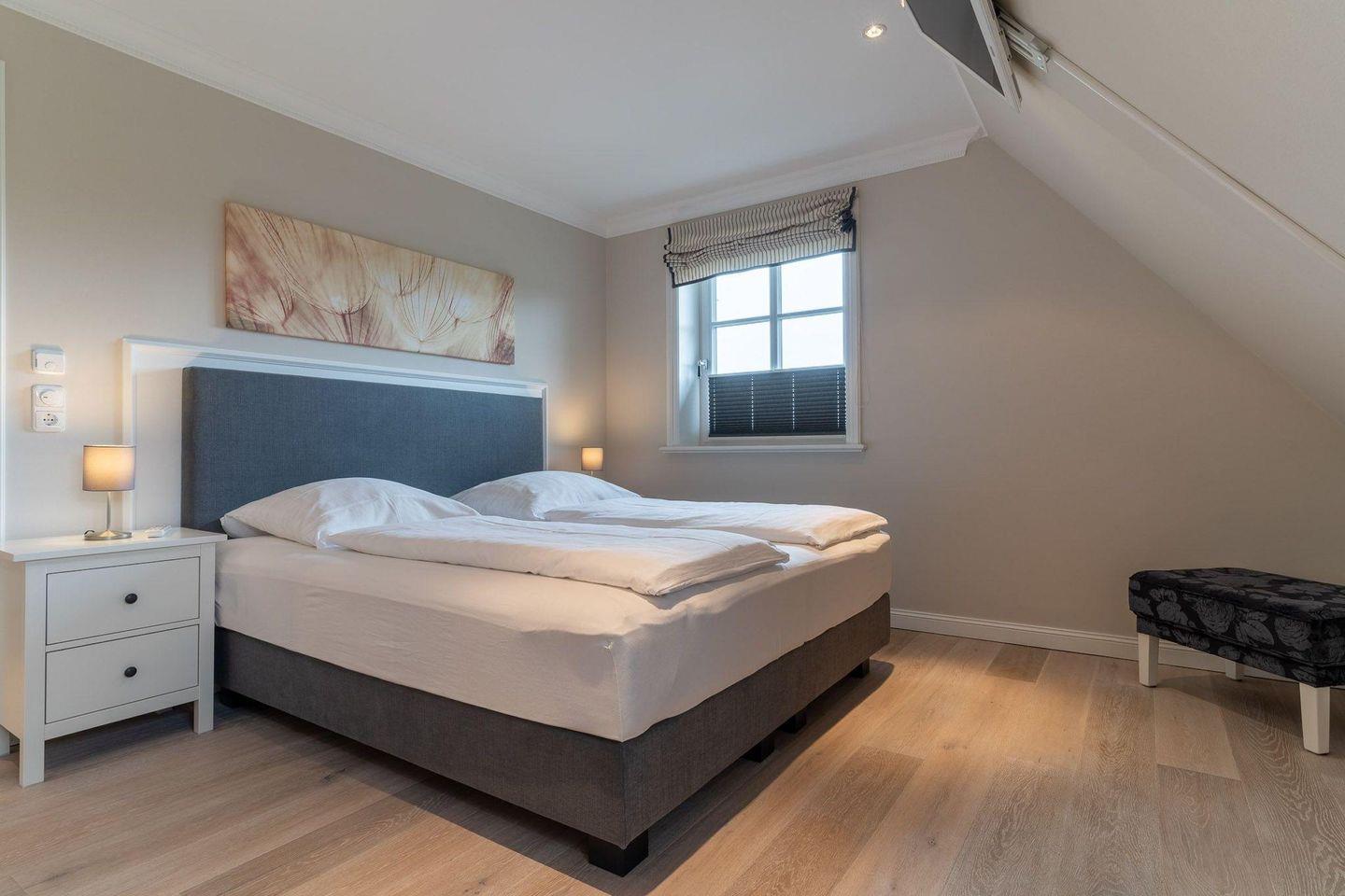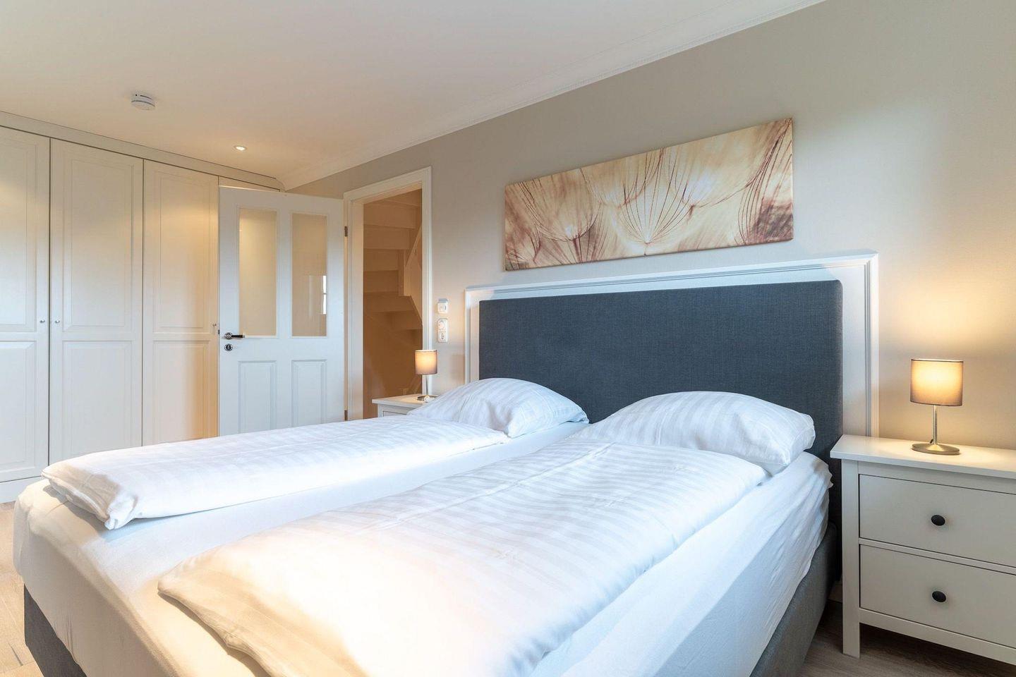 Über eine Holztreppe gelangt man in das mit Parkett ausgelegte Obergeschoss. Die beiden Schlafzimmer, eines mit einem Doppelboxspringbett und ein weiteres mit 2 Einzelboxspringbetten sorgen für ruhevolle Erholung. Einbauschränke gewähren Ihnen hinreichend Ablageflächen. Darüber hinaus befindet sich im Obergeschoss ein weiteres, geräumiges Bad mit Dusche und Badewanne. Dieses wunderschöne Haus lässt keine Wünsche offen und bringt Sie sofort in Urlaubsstimmung.