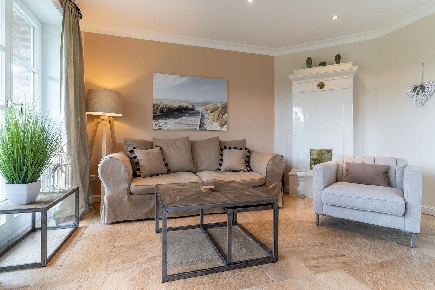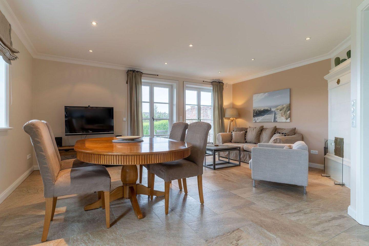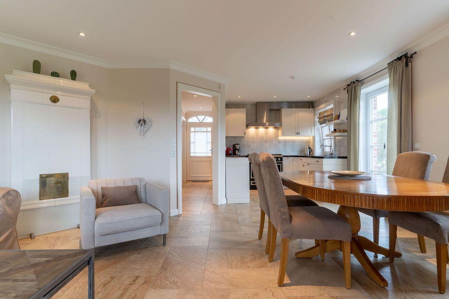 Die wunderschöne Haushälfte unter Reet verfügt über ca. 100 m² Wohnfläche und bietet Platz für 4 Personen. Im Erdgeschoss befindet sich der lichtdurchflutete Wohnraum mit TV, einer offenen Küche sowie einem stilvollen Essbereich. Der Wohnraum ist mit stylischen Möbeln, Kamin und hochwertigem Fliesen ausgestattet. Die Küche verfügt über einen Gasherd, hochwertige Elektrogeräte und ist voll ausgestattet. An den Wohnbereich schließen sich Flur, Hauswirtschaftsraum und Duschbad an.