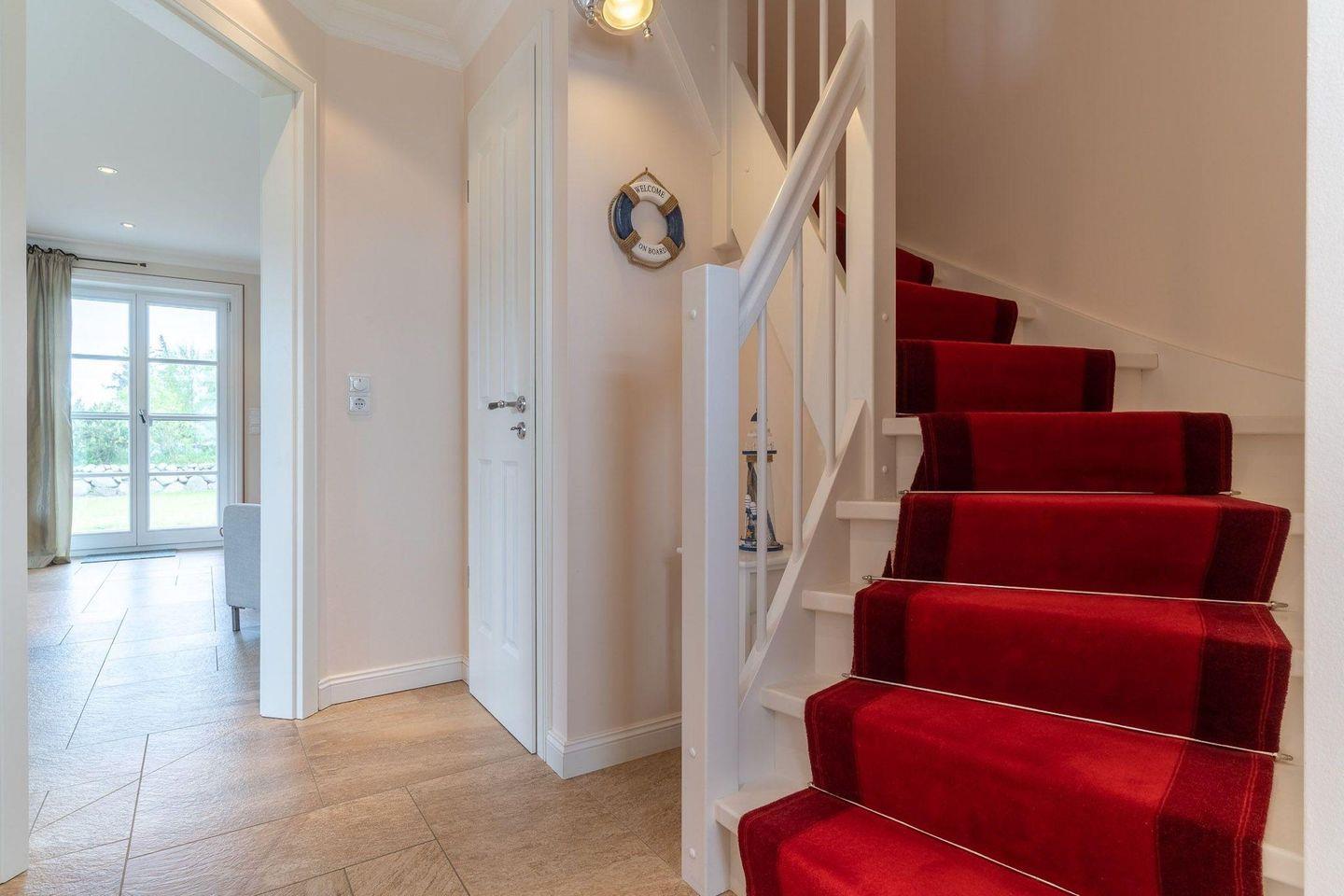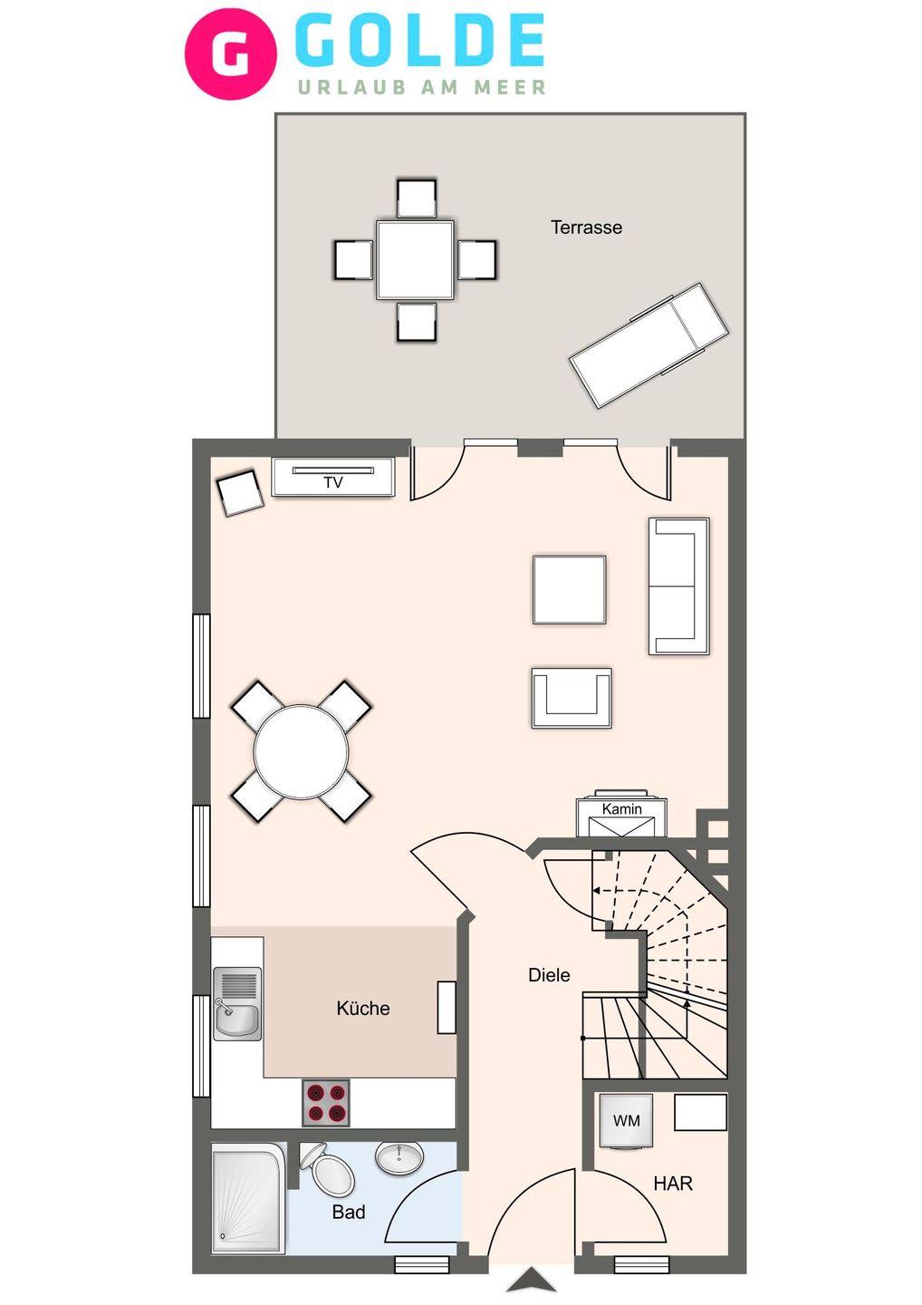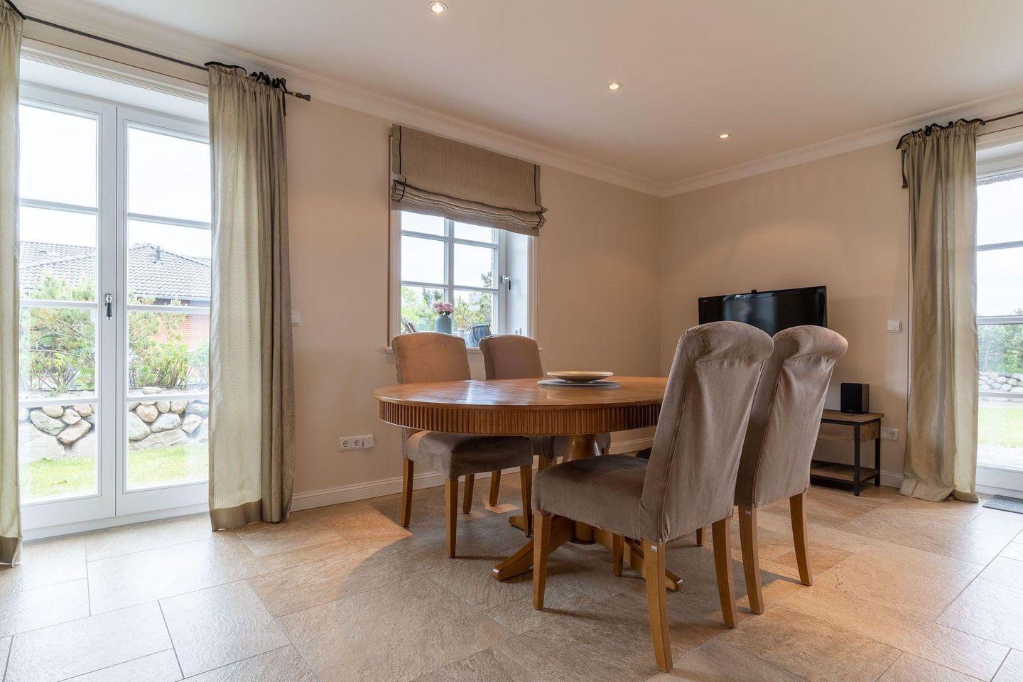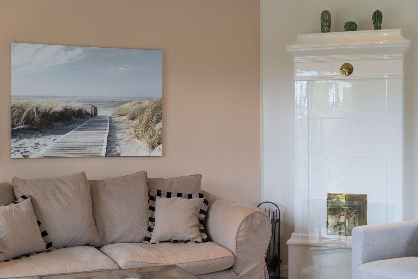 Die wunderschöne Haushälfte unter Reet verfügt über ca. 100 m² Wohnfläche und bietet Platz für 4 Personen. Im Erdgeschoss befindet sich der lichtdurchflutete Wohnraum mit TV, einer offenen Küche sowie einem stilvollen Essbereich. Der Wohnraum ist mit stylischen Möbeln, Kamin und hochwertigem Fliesen ausgestattet. Die Küche verfügt über einen Gasherd, hochwertige Elektrogeräte und ist voll ausgestattet. An den Wohnbereich schließen sich Flur, Hauswirtschaftsraum und Duschbad an.