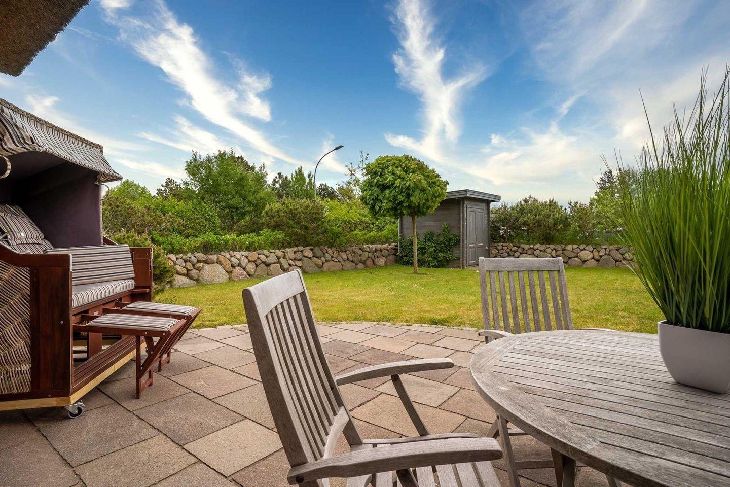 Das Grundstück mit Stellplatz, großer Rasenfläche und einer geschützten, sonnigen Terrasse ist mit heimischen Pflanzen und Dünengras angelegt.