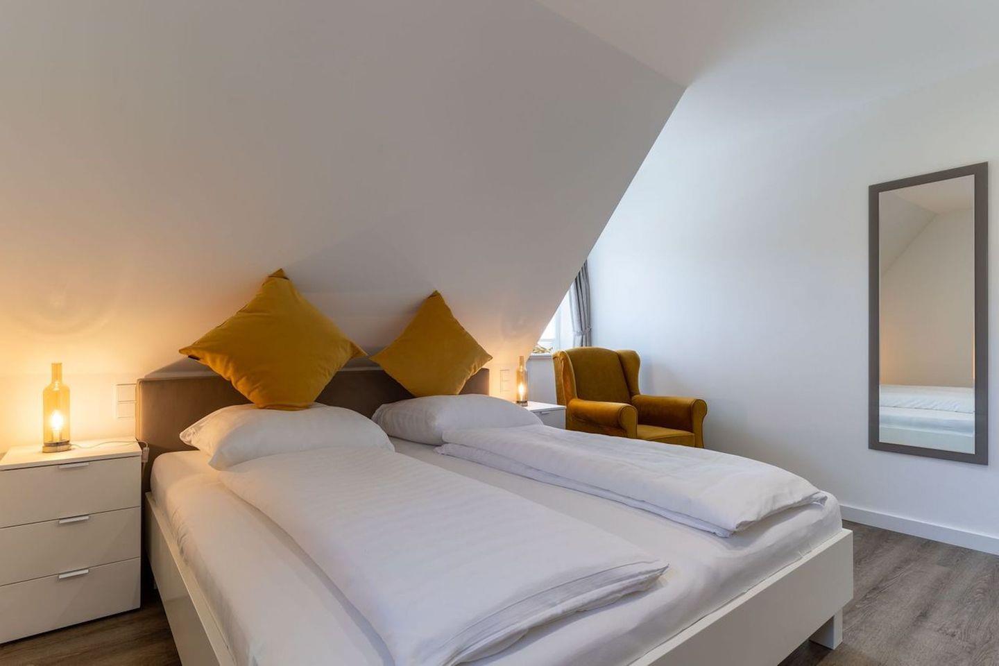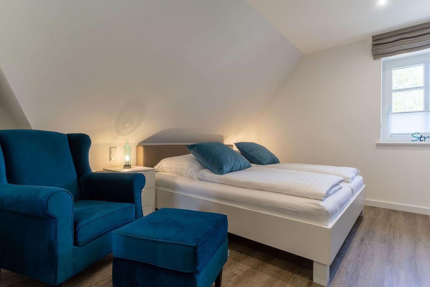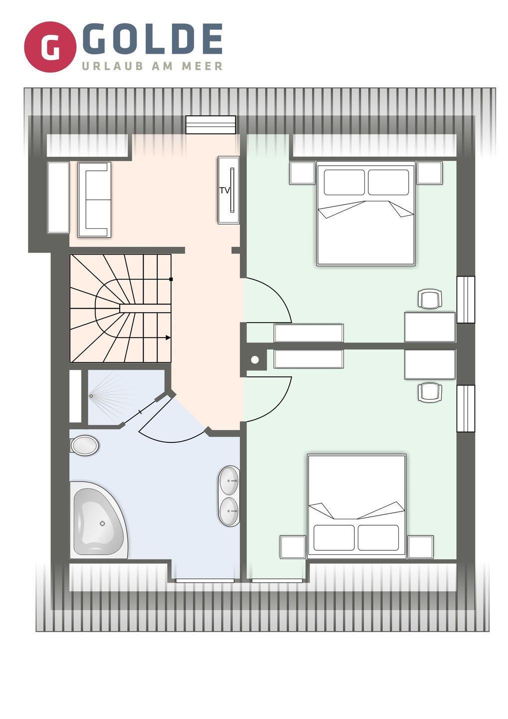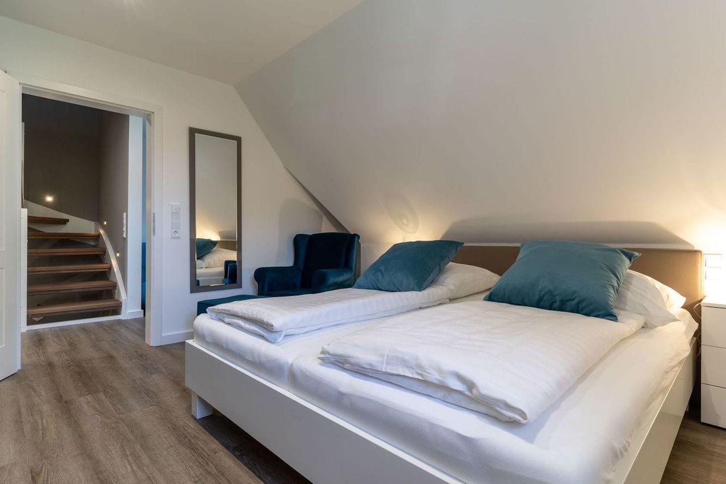 Über eine Holztreppe gelangt man in das Obergeschoss. Die beiden Schlafräume verfügen über komfortable Doppelbetten (1,80 × 2 m), Kleiderschränke gewähren Ihnen hinreichend Ablageflächen.