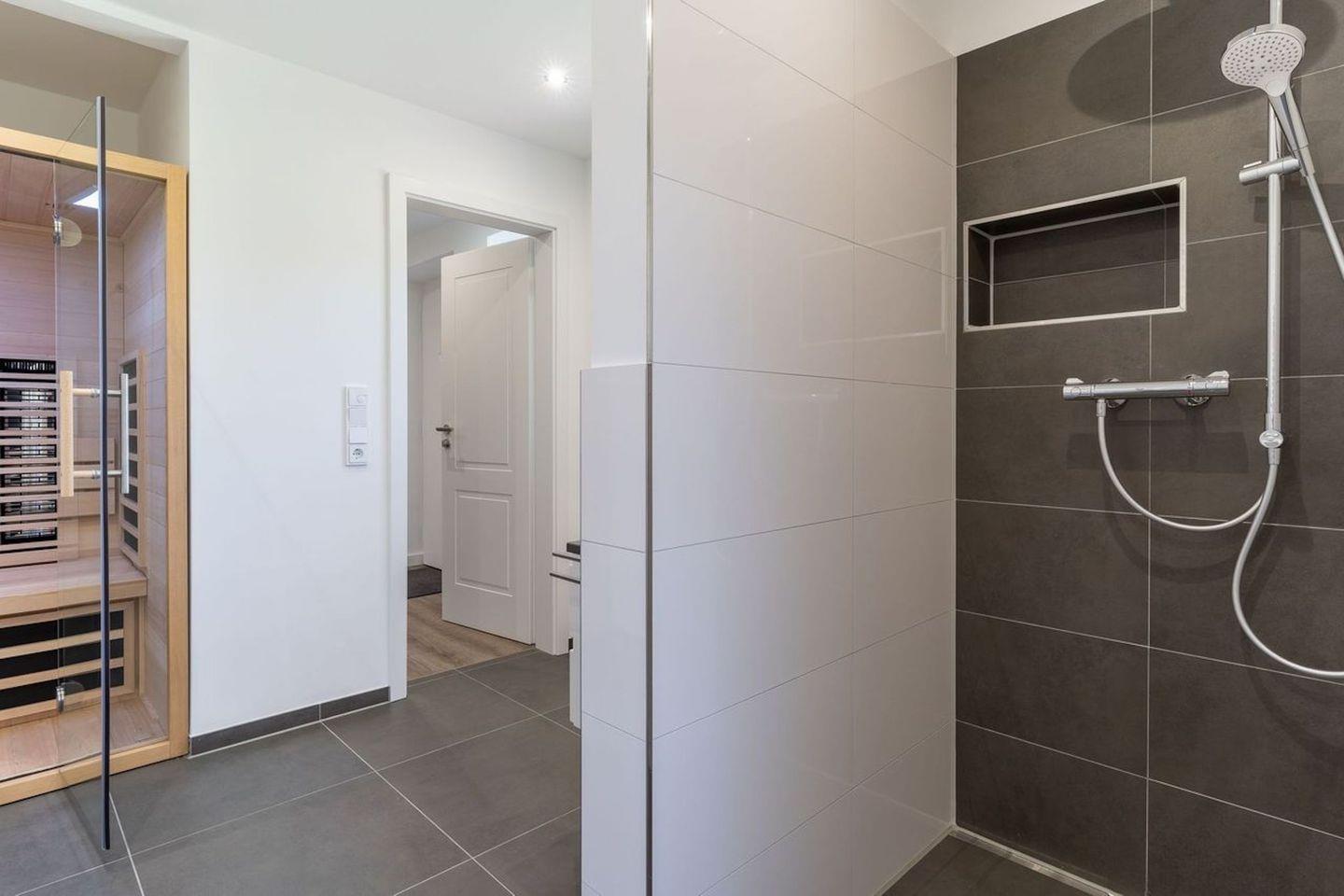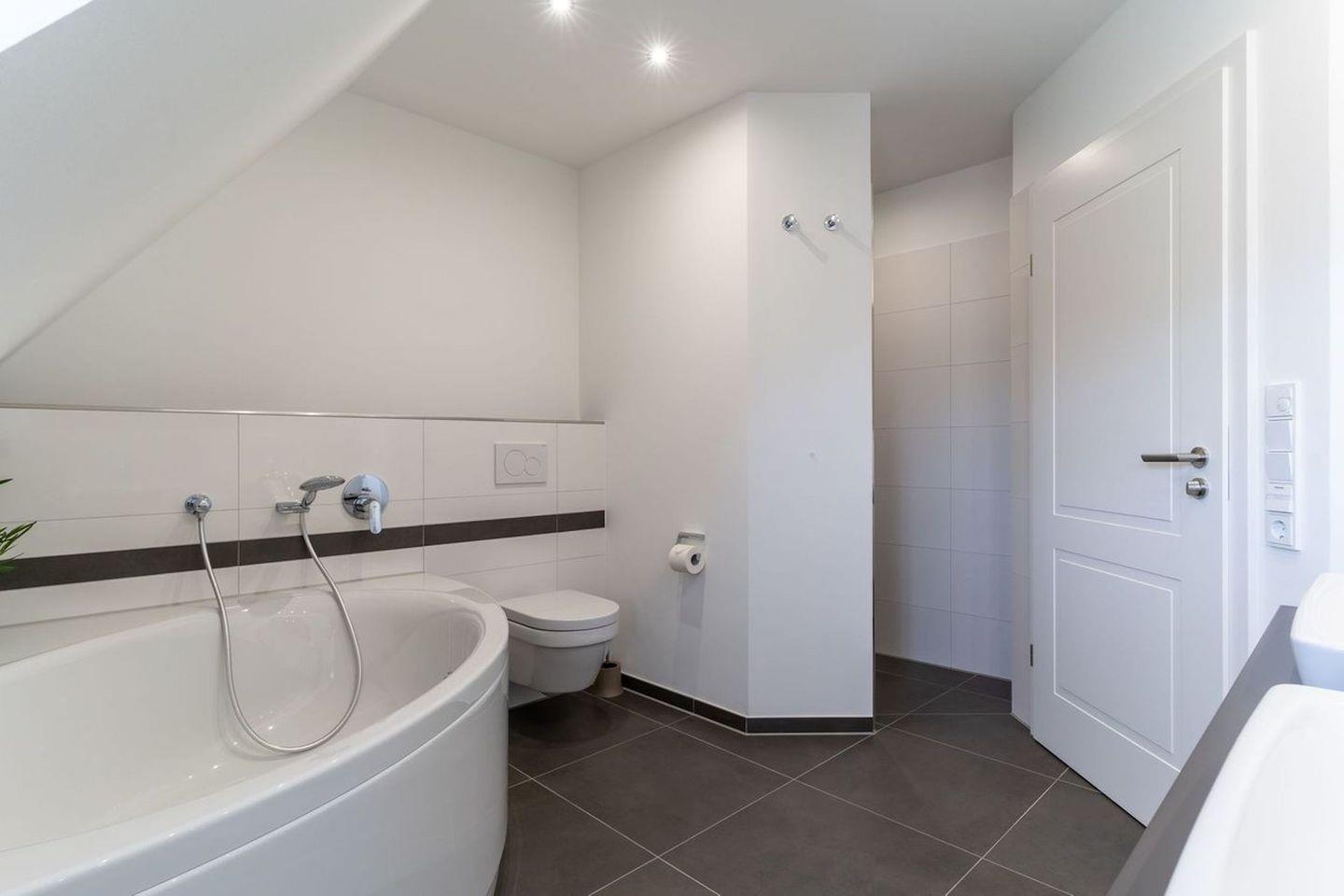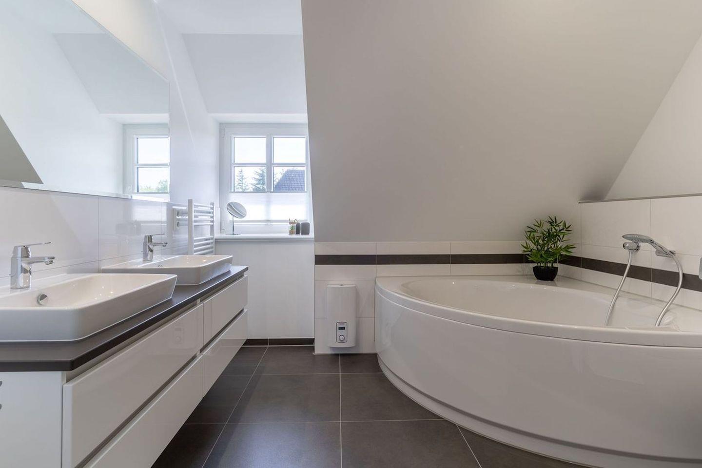 Ein weiteres Badezimmer mit einer Badewanne, einer Dusche und zwei einzelnen Waschbecken runden das hochwertige Hauskonzept ab und lassen keine Wünsche offen.