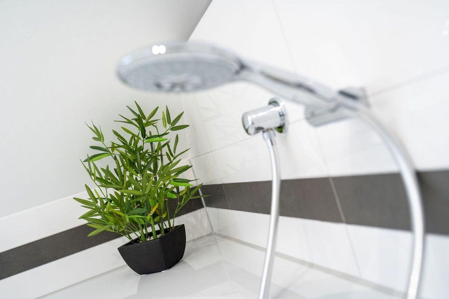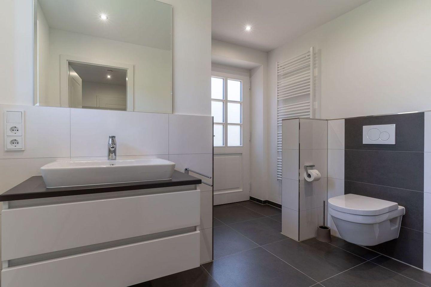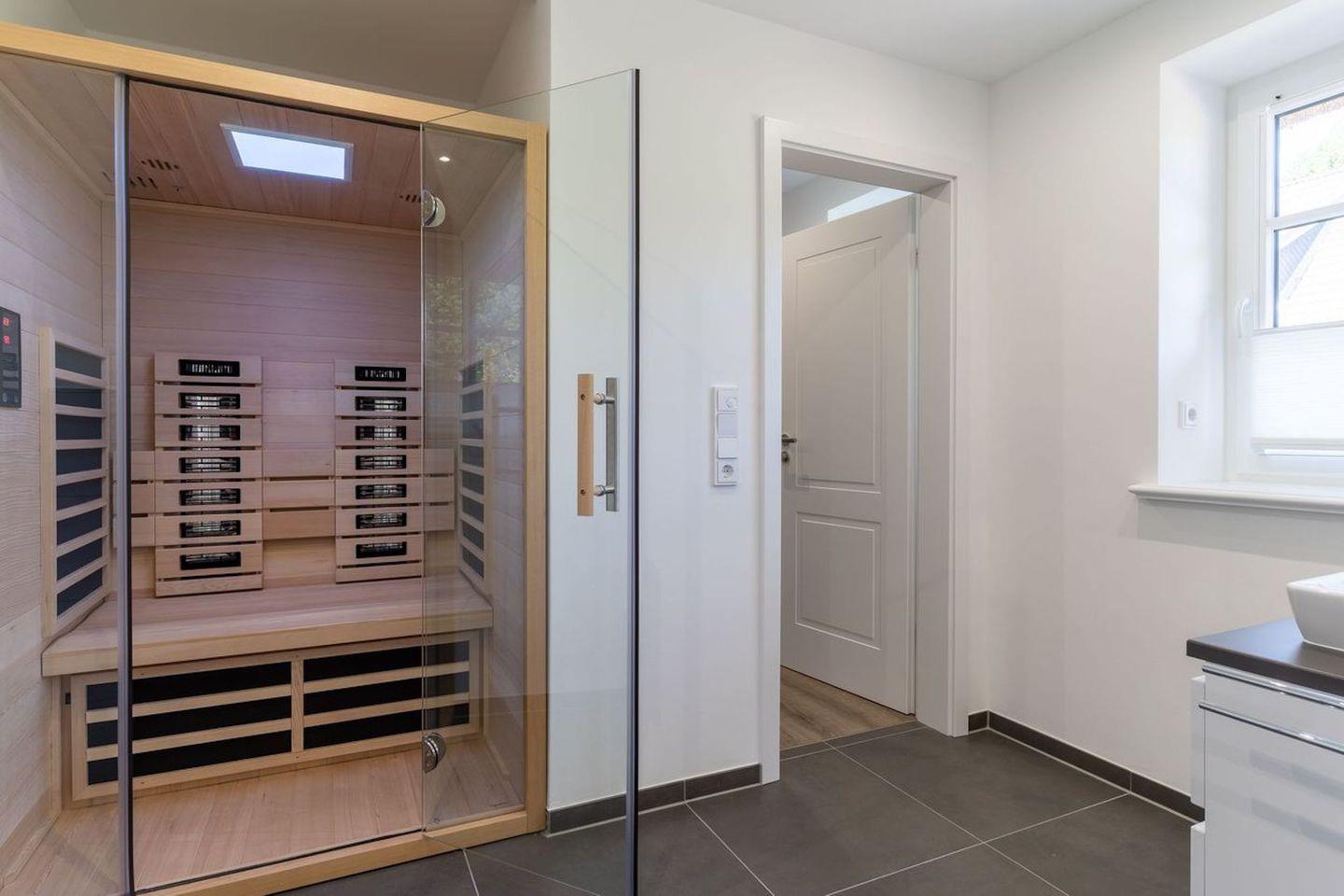 Ein weiteres Badezimmer mit einer Badewanne, einer Dusche und zwei einzelnen Waschbecken runden das hochwertige Hauskonzept ab und lassen keine Wünsche offen.