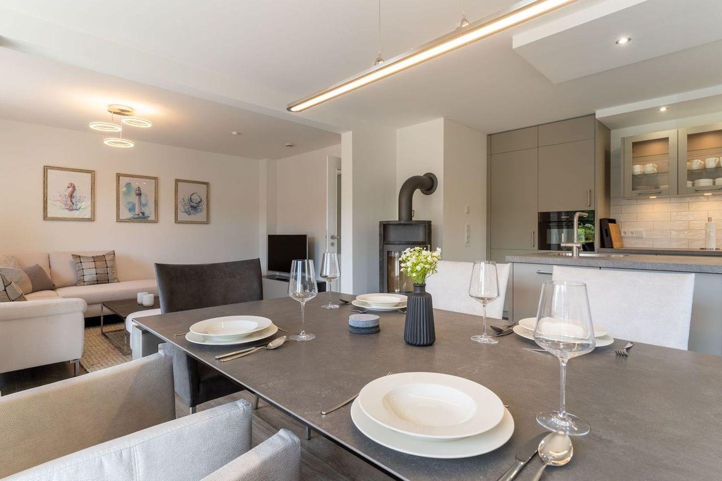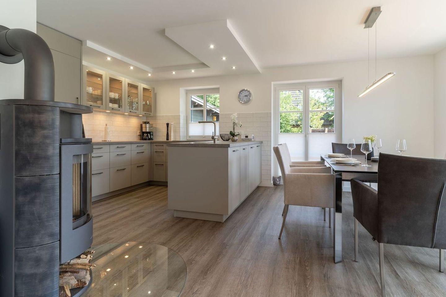 Im Erdgeschoss erwartet Sie ein lichtdurchflutetes Wohnzimmer mit einem Kamin, einer offenen Küche sowie einem integrierten Esszimmer mit hochwertigen Möbeln. Die Küche verfügt über hochwertige Elektrogeräte und genügend Platz zum gemeinsamen Kochen.