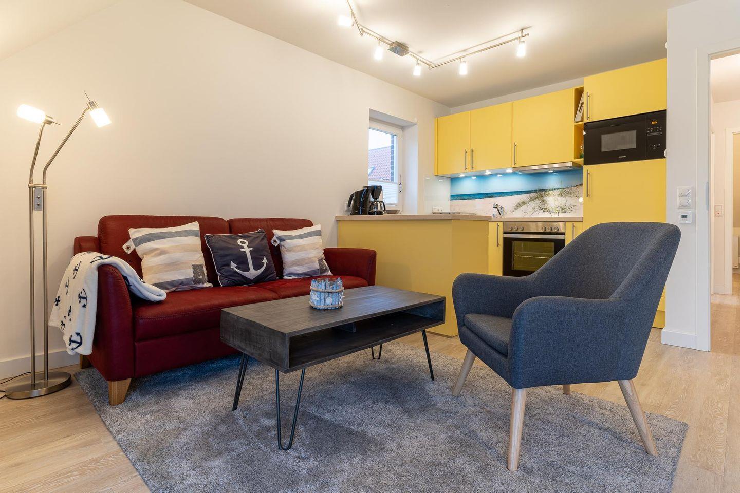 In der geräumigen Wohnküche können Sie sich selbst versorgen und haben dabei den neuesten technischen Standard zur Verfügung, inklusive Backofen, Mikrowelle und Kühl-/Gefrierkombi. Von hier aus gelangen Sie auch auf den Balkon, wo Sie die frische Nordseeluft genießen und die Seele baumeln lassen können. Das untere Schlafzimmer verfügt über ein bequemes Doppelbett und ausreichend Stauraum in den Einbauschränken. Über eine Treppe vom Flur aus gelangen Sie in das obere Schlafzimmer, das durch seine lichtdurchflutete und großzügige Bauweise besticht. Hier stehen Ihnen zwei Einzelbetten, eine Sitzecke und weitere Einbauschränke zur Verfügung.