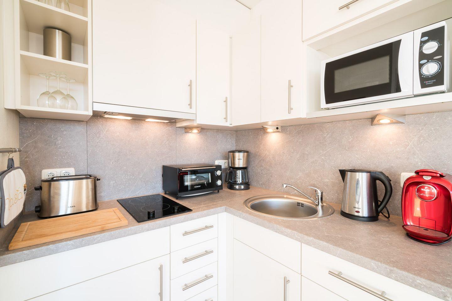 Die integrierte Küchenzeile bietet alles, was Sie für die Zubereitung Ihrer Lieblingsspeisen benötigen, und der Essplatz mit Blick auf das Meer lässt Sie entspannt frühstücken oder speisen. Im modernen Duschbad können Sie nach einem erlebnisreichen Tag am Strand eine erfrischende Dusche genießen.