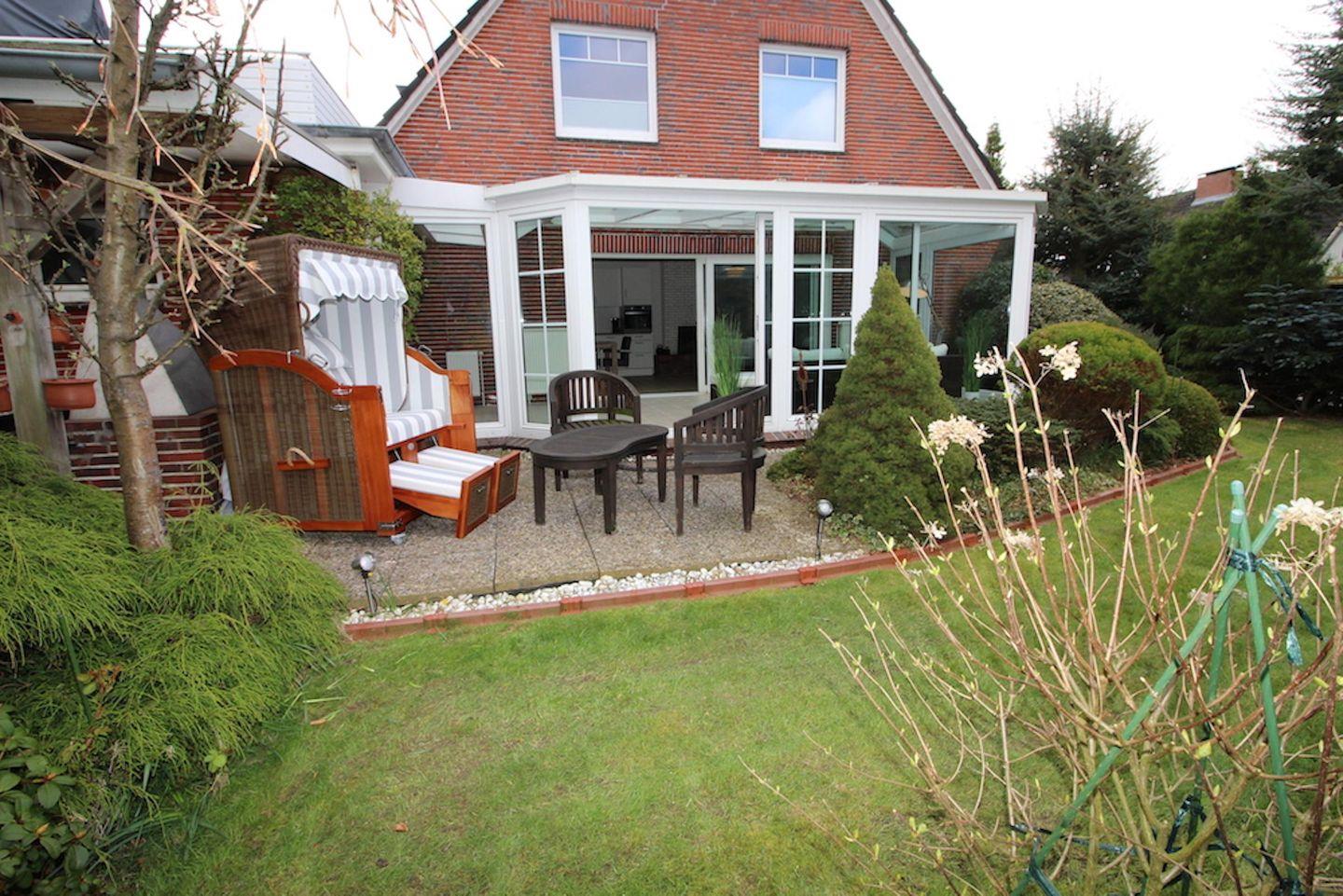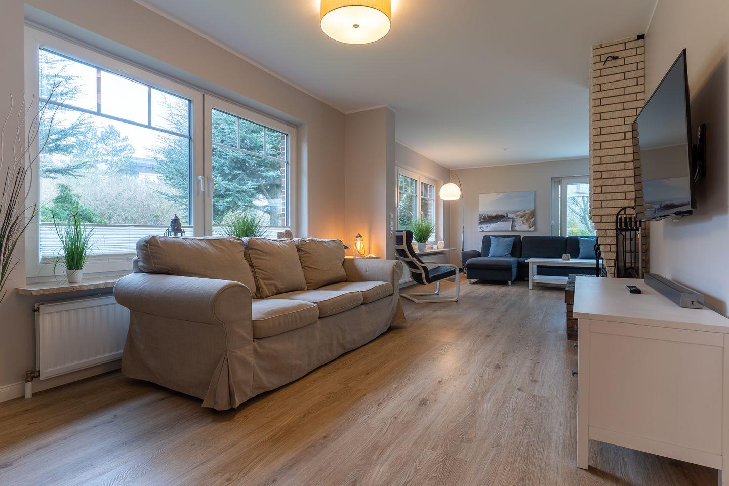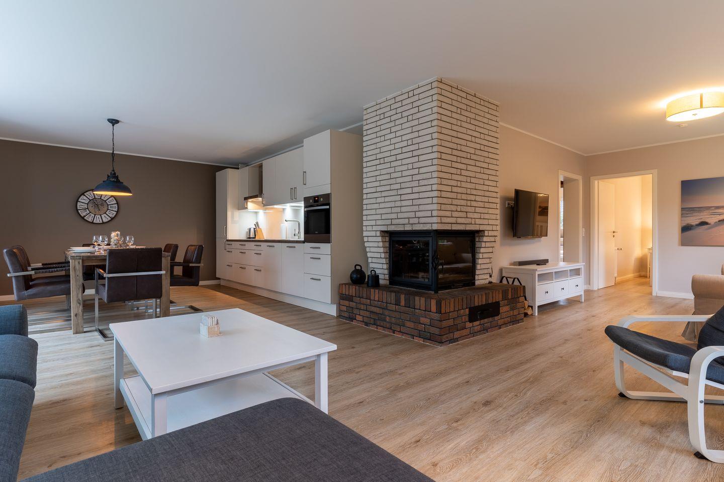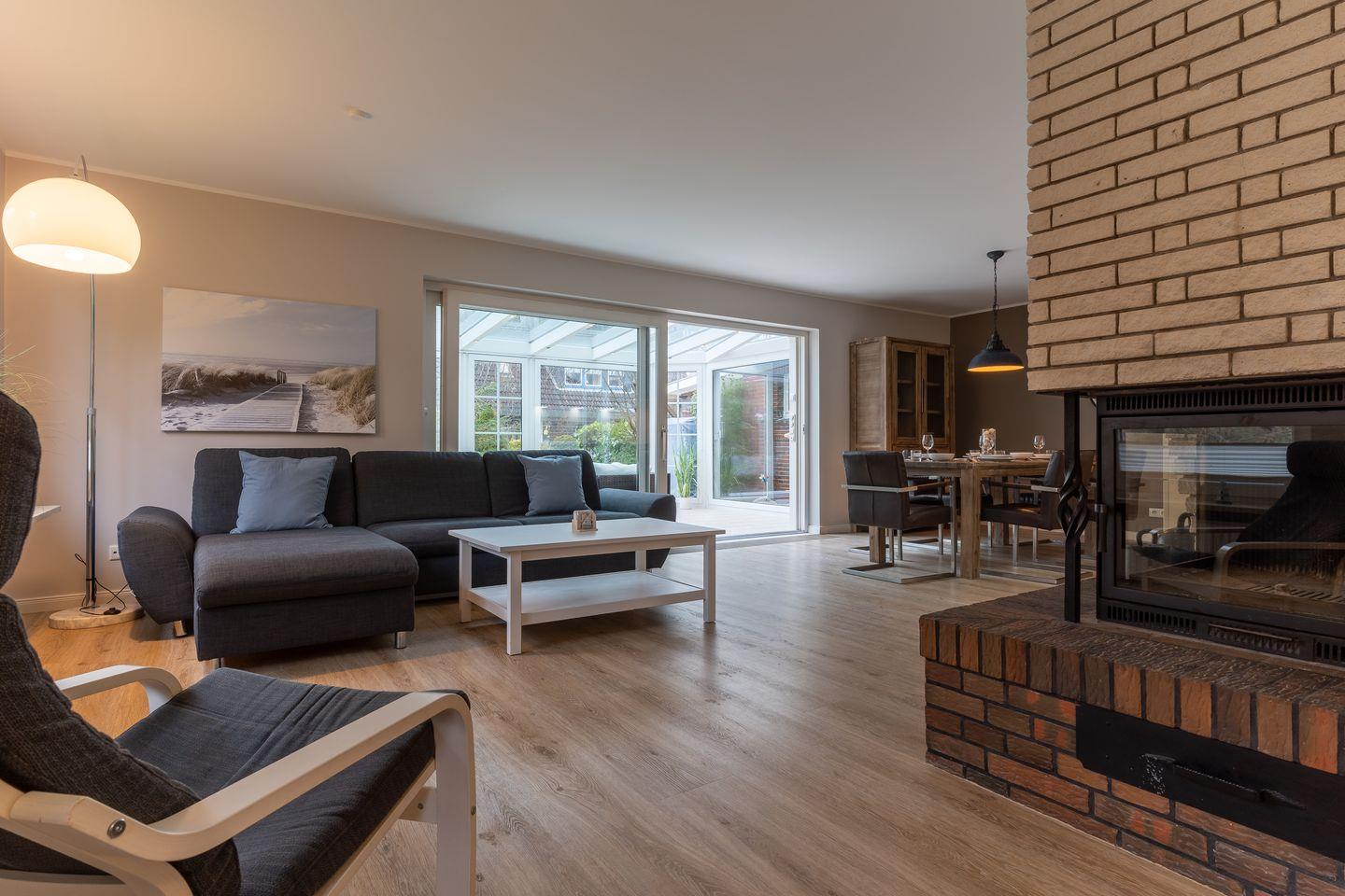 Modern eingerichtetes Appartement Rückenwind in St. Peter-Ording mit Wintergarten, Garten und Kamin für einen erholsamen Urlaub.