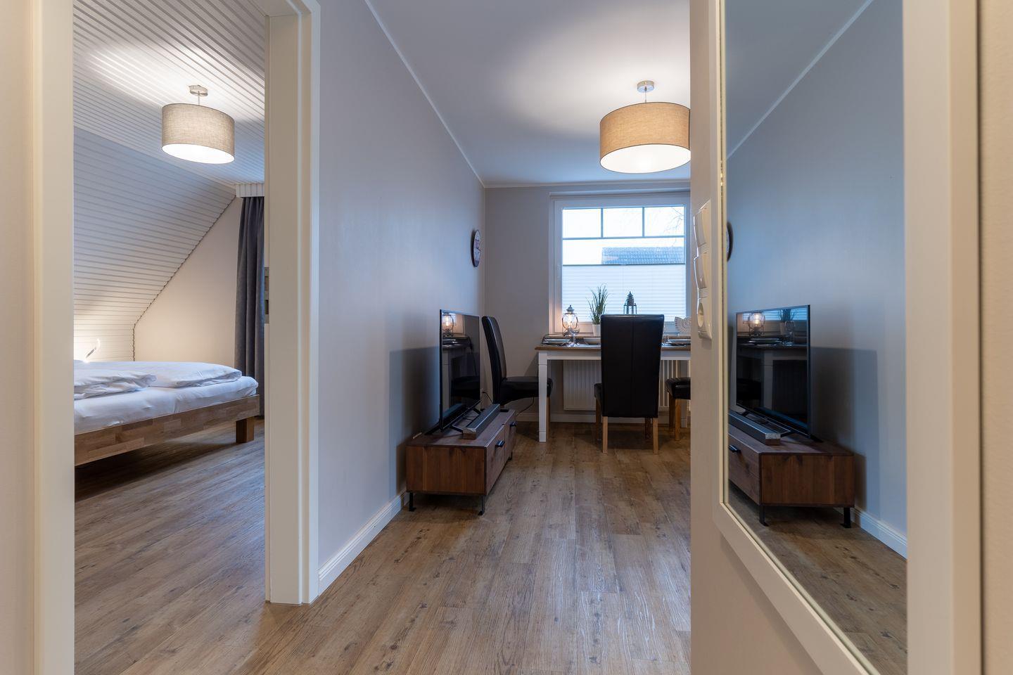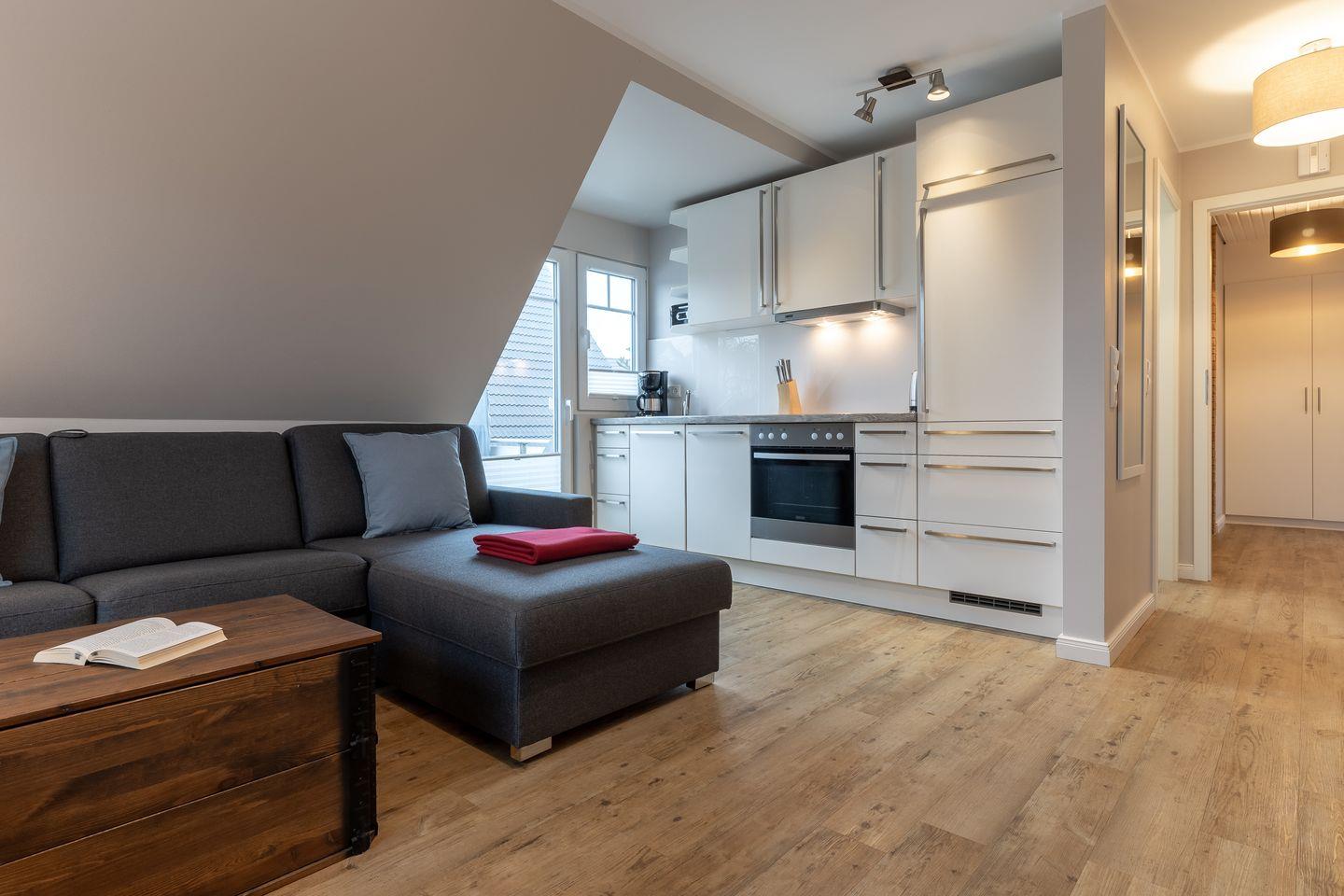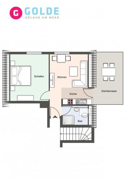 Das App. "Bad" im Ferienhaus Rückenwind verfügt über ca. 45 m² Wohnfläche und bietet Platz für 1-3 Personen. Die Wohnung befindet sich im Obergeschoss mit einem großzügige Wohnraum mit TV und einer modernen Wohnküche. Die Wohnräume sind mit neuen und modernen Möbeln ausgestattet. An den Wohnbereich schließen sich ein Duschbad, sowie ein Schlafzimmer mit einem Doppelbett (1,80 x 2,00 m) an. Zusätzlich gibt es im Wohnzimmer ein gemütliches Schlafsofa (1,40 x 2,00 m) für eine Personen. Vom Wohnzimmer gelangen Sie auf eine großzügige Dachterrasse. Hier können Sie wunderbar entspannen und die Seele baumeln lassen.