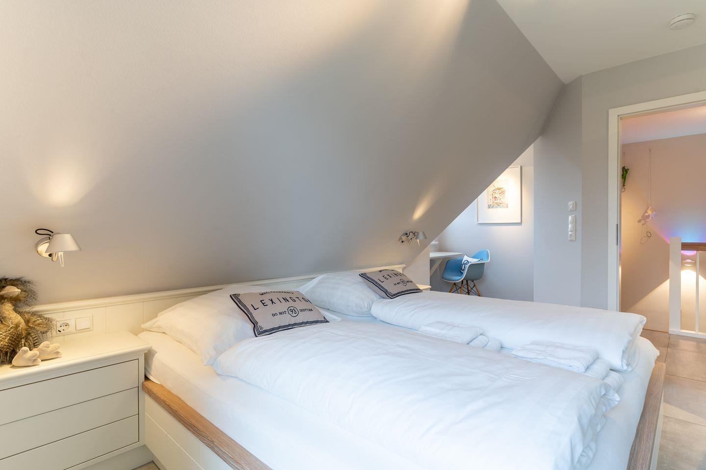 Über eine Holztreppe gelangt man in das Obergeschoss. Die beiden Schlafzimmer sind jeweils mit einem hochwertigen Doppelbett (180x200), Verdunkelung und TV Gerät ausgestattet. Im gesamten Haus sind Fliegengitter angebracht. Das Haus verfügt über eine Fußbodenheizung.