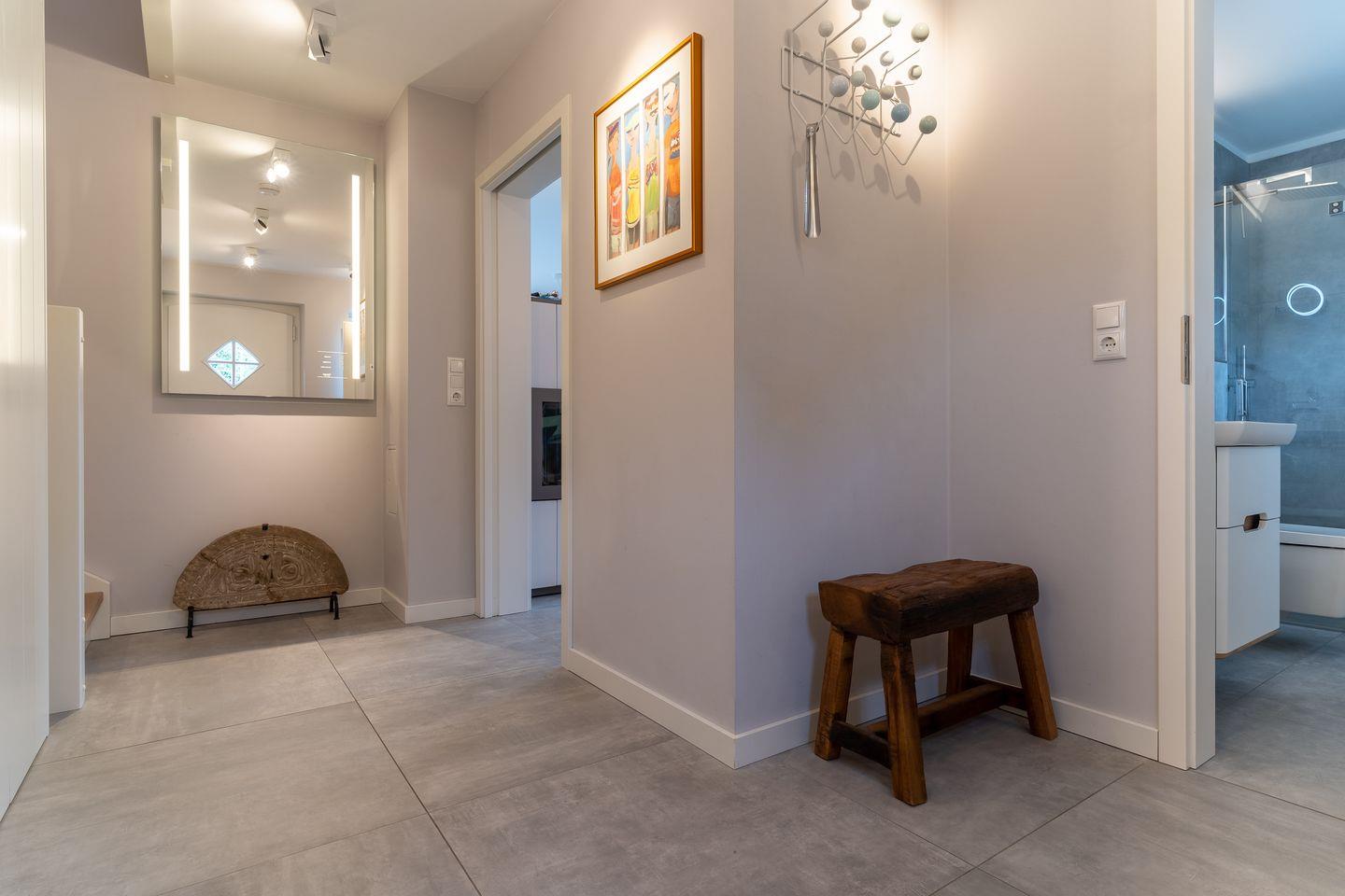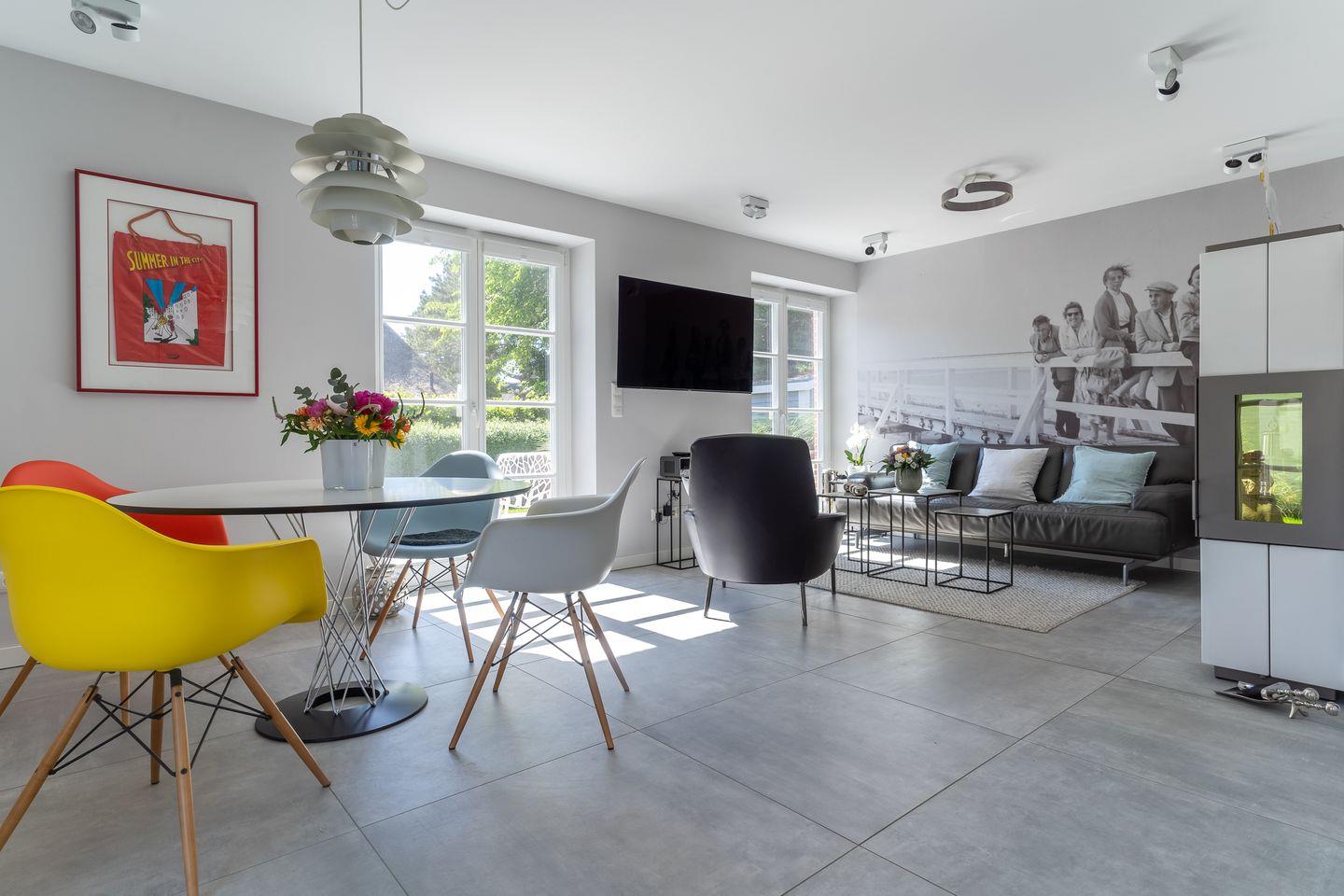 Die wunderschöne Haushälfte unter Reet verfügt über ca. 85 m² Wohnfläche und bietet Platz für 4 Personen. Im Erdgeschoss befindet sich der lichtdurchflutete Wohnraum mit TV, einer luxuriösen, offenen Küche sowie einem stilvollen Essbereich. Der Wohnraum ist mit modernen, stylischen Möbeln und einem wohligen Kamin geschmackvoll eingerichtet. Die Küche verfügt über hochwertige Elektrogeräte und ist voll ausgestattet. An den Wohnbereich schließen sich Flur, Hauswirtschaftsraum und ein Duschbad an.