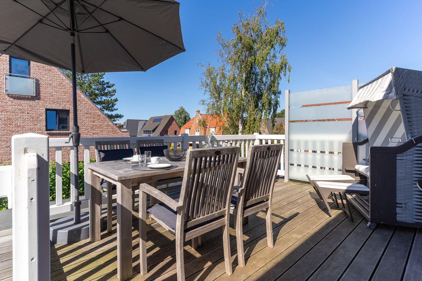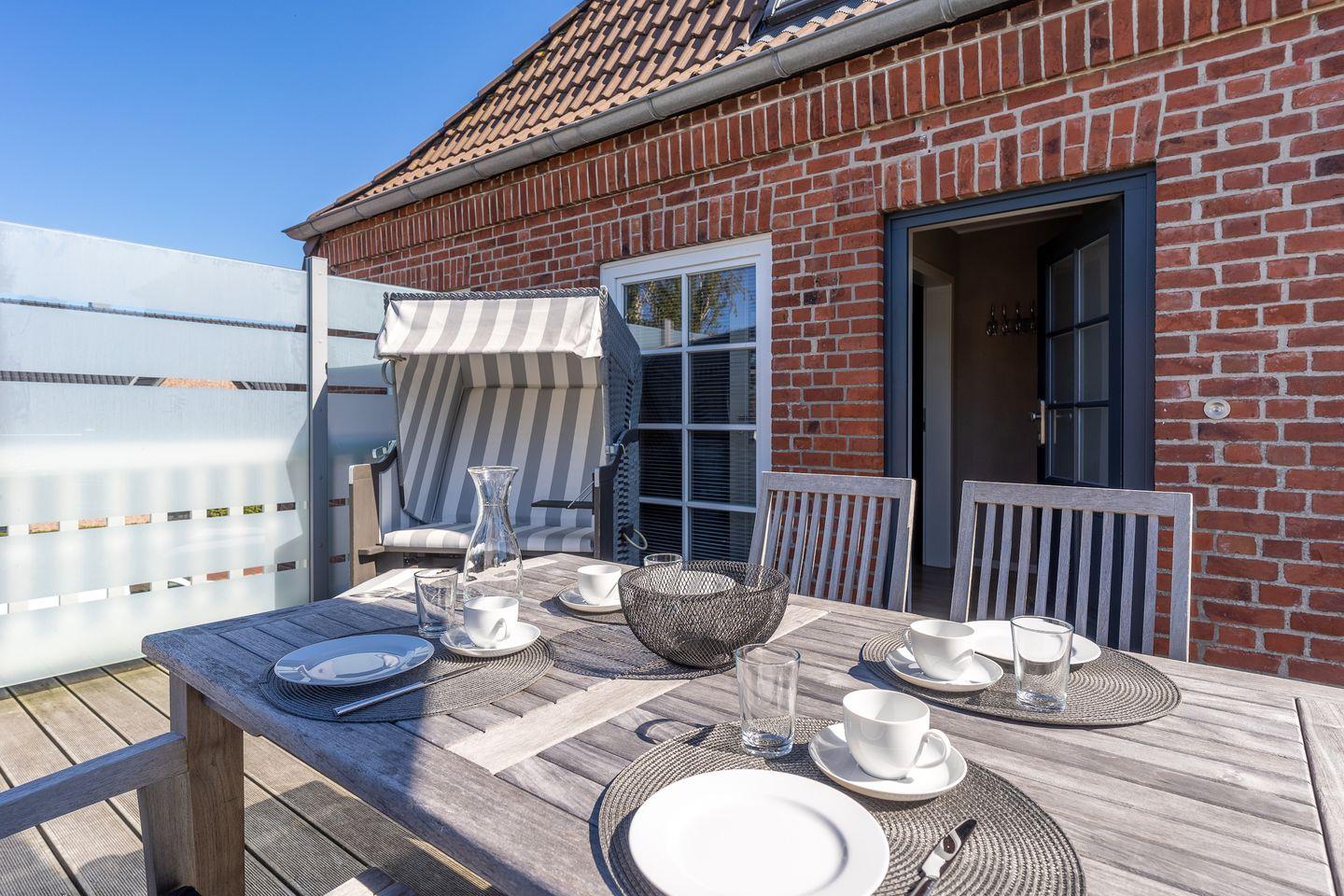 Das Grundstück ist im Herzstück des Dorfes gelegen. Das Appartement bietet einen eigenen Stellplatz und einen großzügigen Balkon mit schützendem Windfang. Aus dem Strandkorb heraus überblicken Sie das Anwesen, das mit heimischen Pflanzen, Obstbäumen und einer Düne angelegt ist.