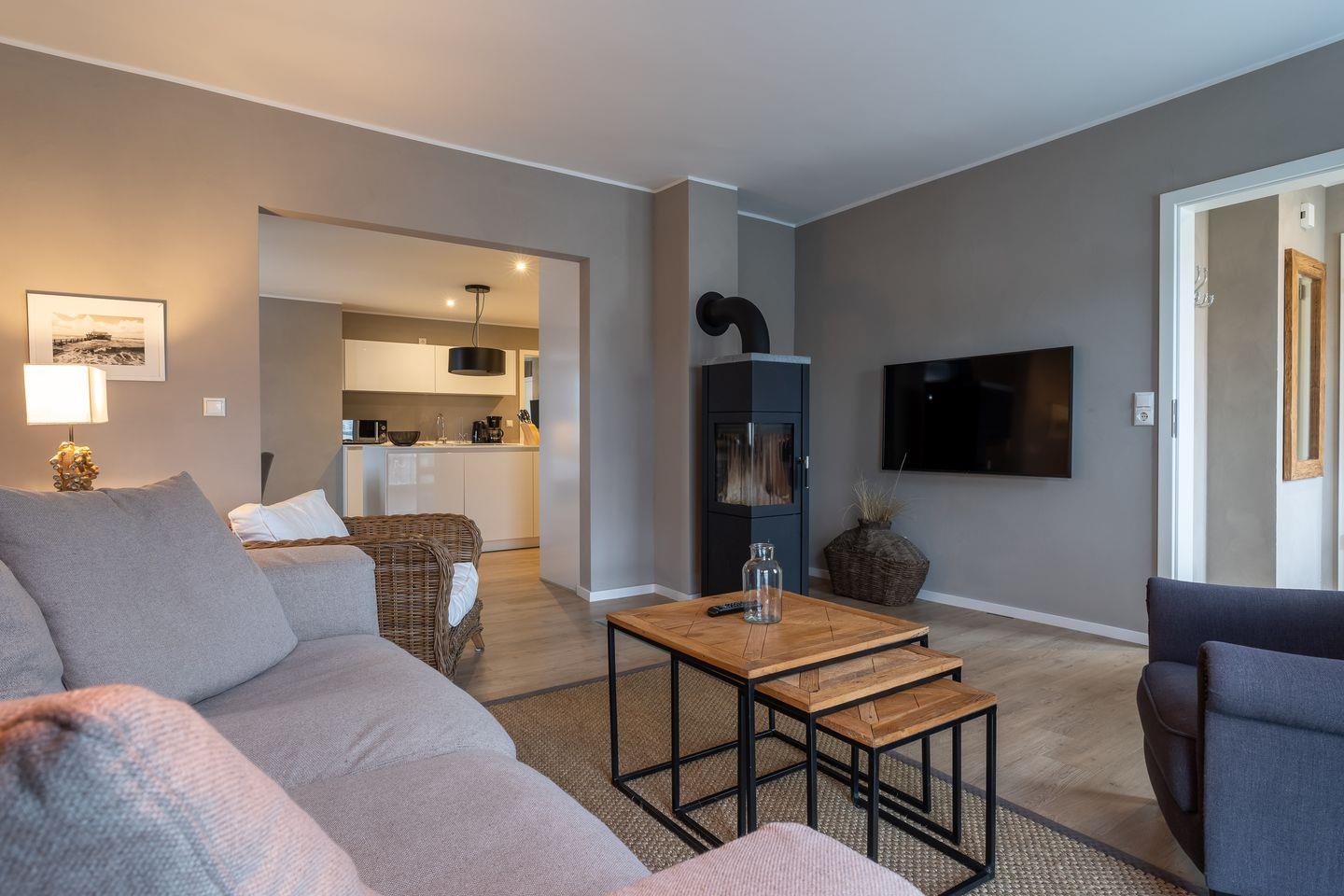 In der ersten Etage, die über eine großzügige Außenholztreppe zu erreichen ist, befindet sich der lichtdurchflutete Wohnraum mit TV, Kamin, einer offenen Küche mit Küchenblock sowie einen stilvollen Essbereich. Die Küche ist mit hochwertigen Elektrogeräten ausgestattet und bildet mit seinem angrenzenden Wohnraum das Herzstück des Appartements. Die Wohn- und Schlafräume sind mit exklusiven Möbeln von Riviera Maison ausgestattet. An den Wohnbereich schließen sich ein Windfang mit Garderobe und ein mit edlen Granitfliesen und Fußbodenheizung ausgestattetes Duschbad an. Die Wohnung verfügt über einen geschmackvollen Dekorholzfußboden.