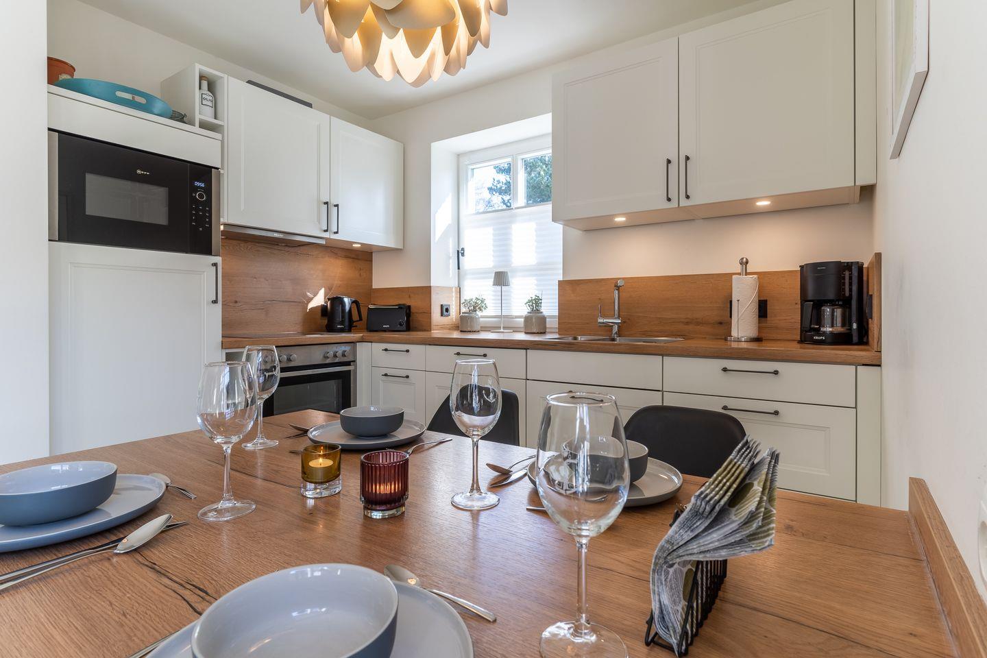 Die offene Wohnküche im Landhausstil ist voll ausgestattet mit Marken-Elektrogeräten, hochwertigen Porzellan und Küchenzubehör.