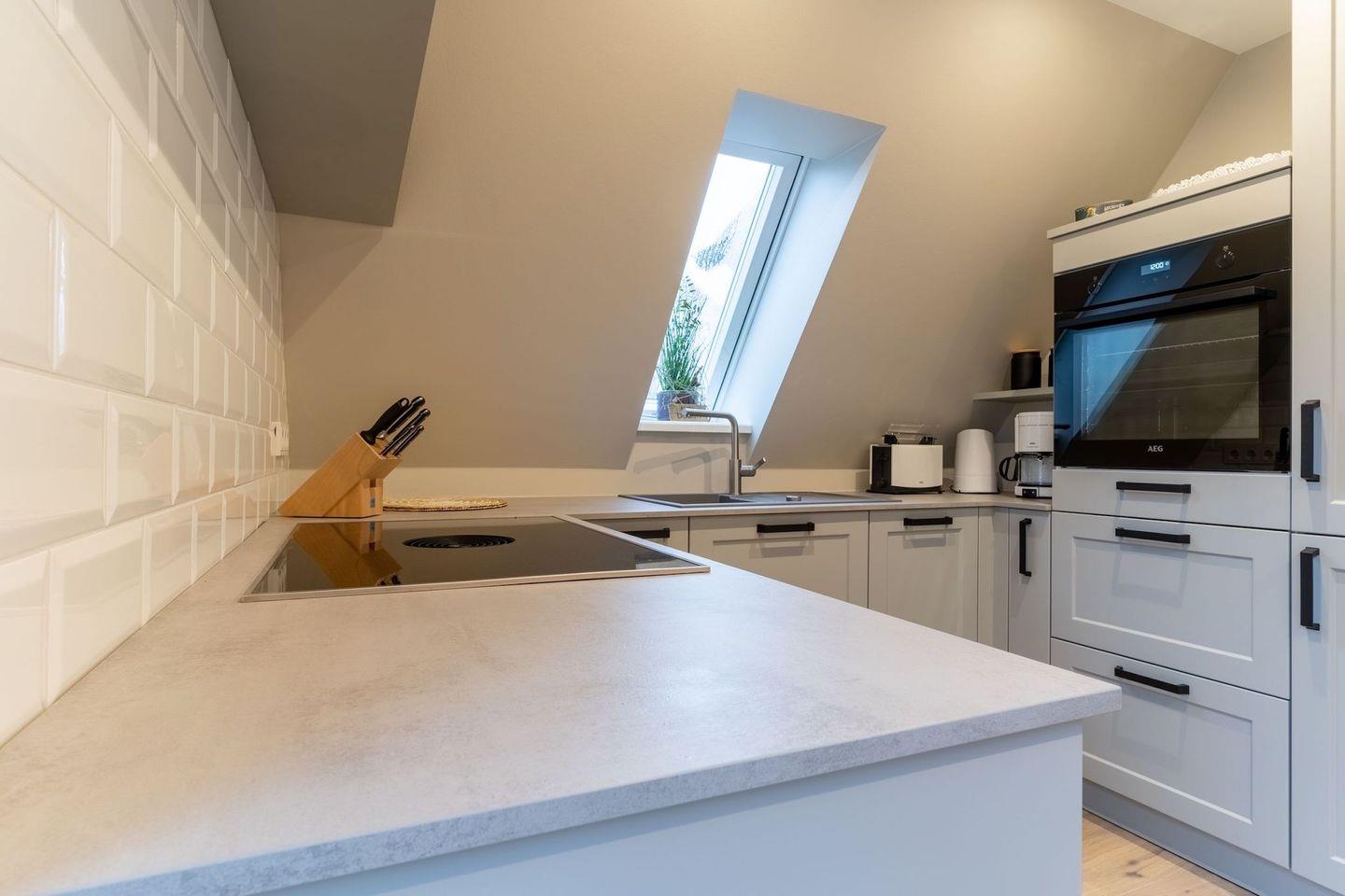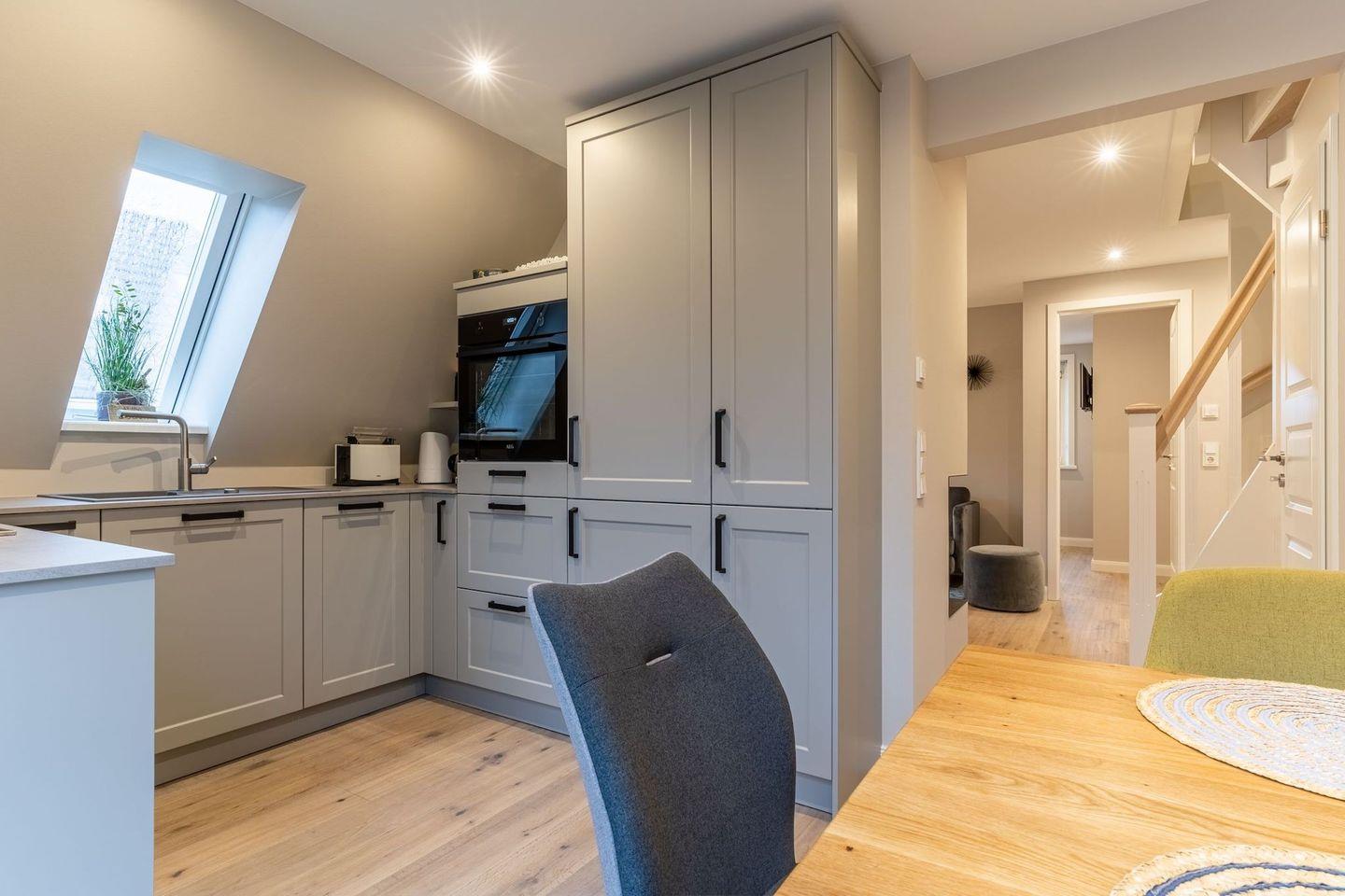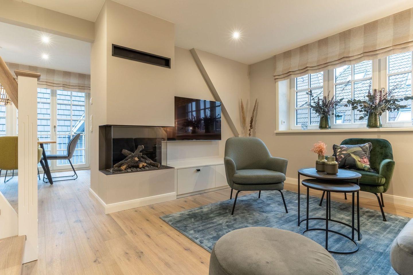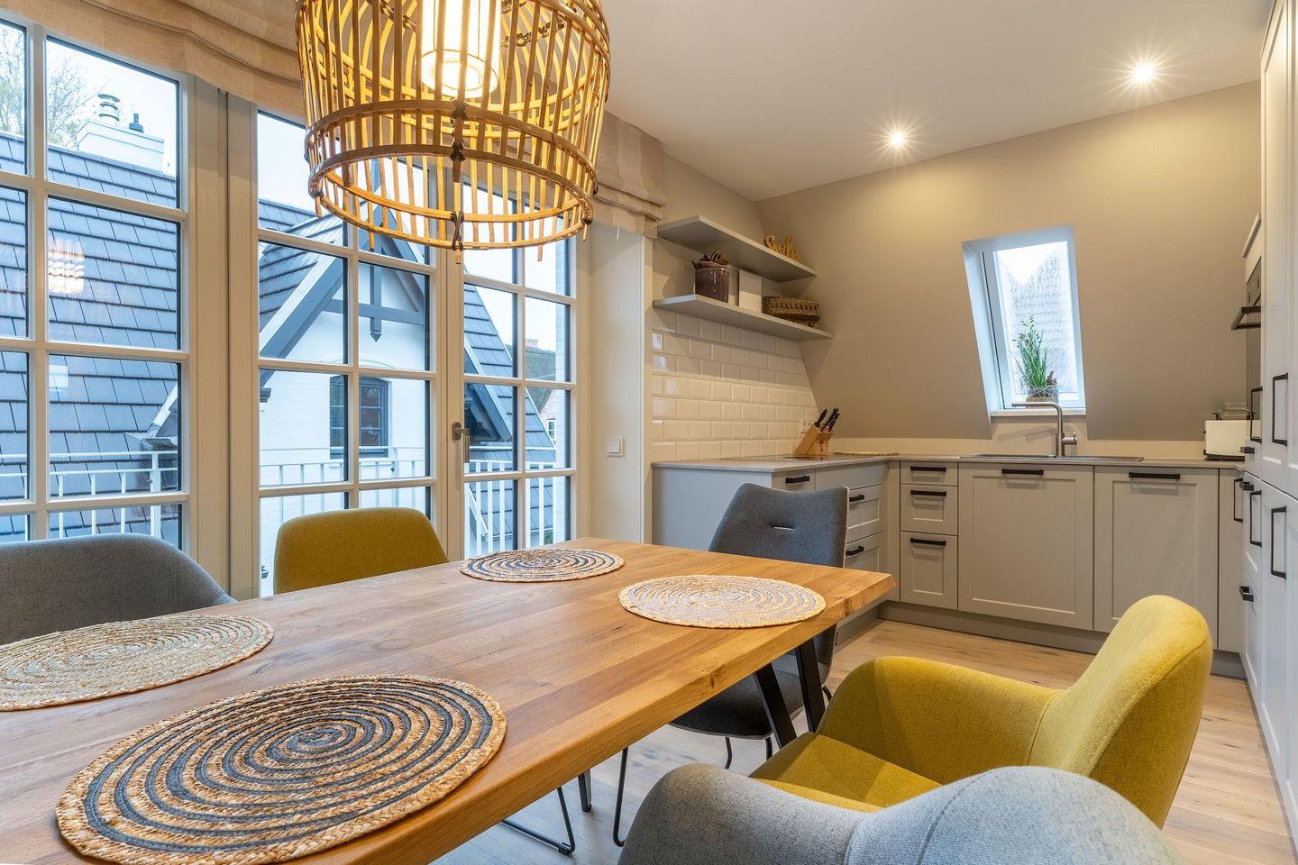 In der ersten Etage im Obergeschoss, welches Sie über einen separaten Hauseingang erreichen, befindet sich der lichtdurchflutete Wohnraum mit TV, Gaskamin, einer offenen Küche sowie einem stilvollen Essbereich mit Balkonzugang. Die Küche ist mit hochwertigen Elektrogeräten ausgestattet und bildet mit seinem angrenzenden Wohnraum das Herzstück des Appartements. Die Wohn- und Schlafräume sind mit exklusiven Möbeln und Parkettboden ausgestattet.