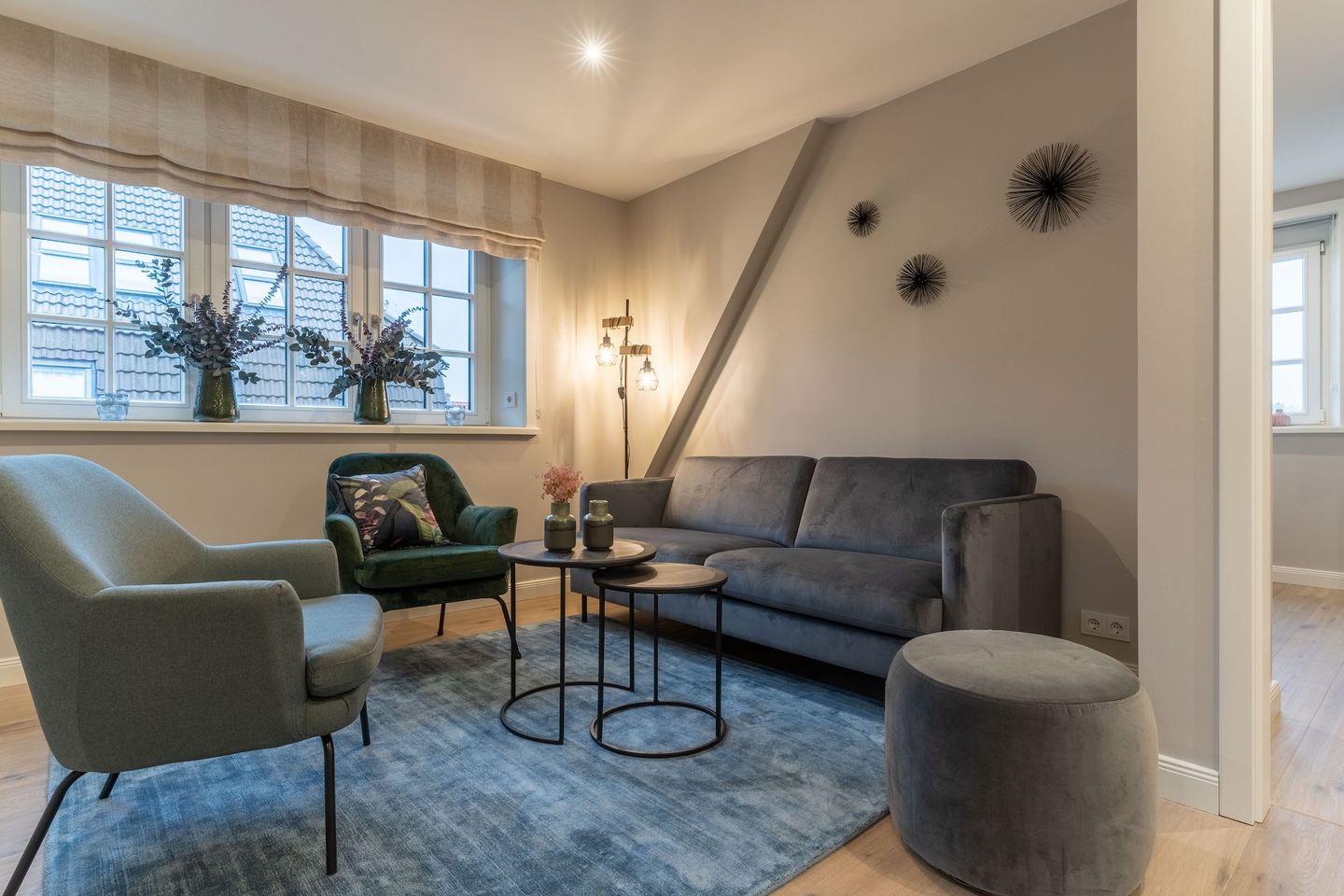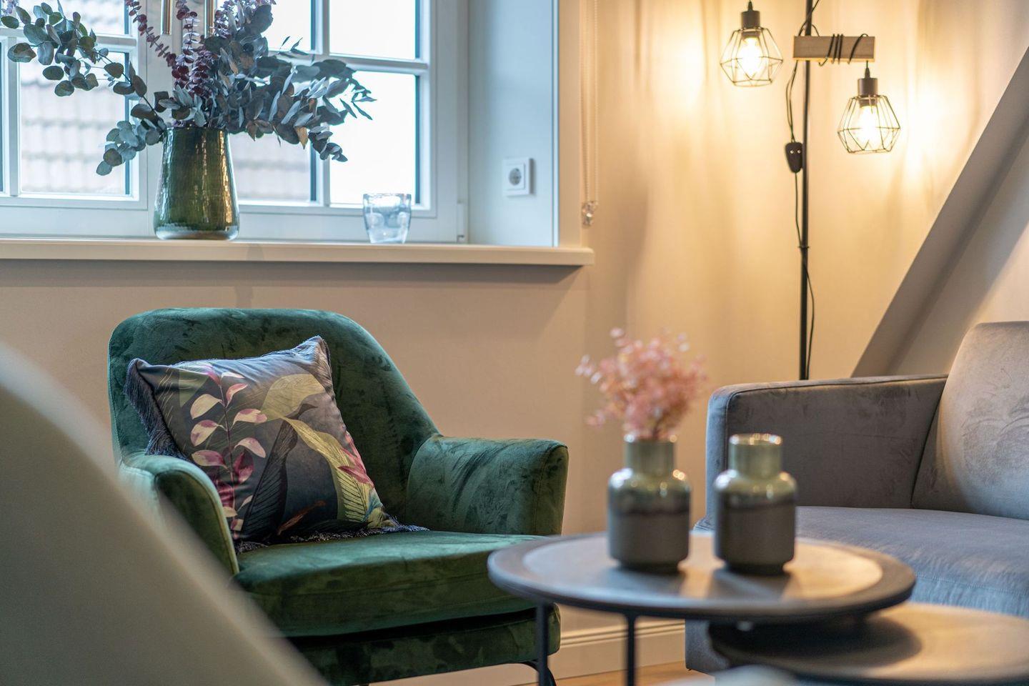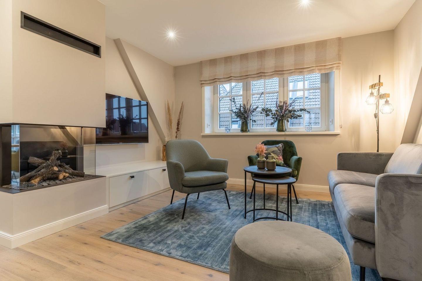 In der ersten Etage im Obergeschoss, welches Sie über einen separaten Hauseingang erreichen, befindet sich der lichtdurchflutete Wohnraum mit TV, Gaskamin, einer offenen Küche sowie einem stilvollen Essbereich mit Balkonzugang. Die Küche ist mit hochwertigen Elektrogeräten ausgestattet und bildet mit seinem angrenzenden Wohnraum das Herzstück des Appartements. Die Wohn- und Schlafräume sind mit exklusiven Möbeln und Parkettboden ausgestattet.