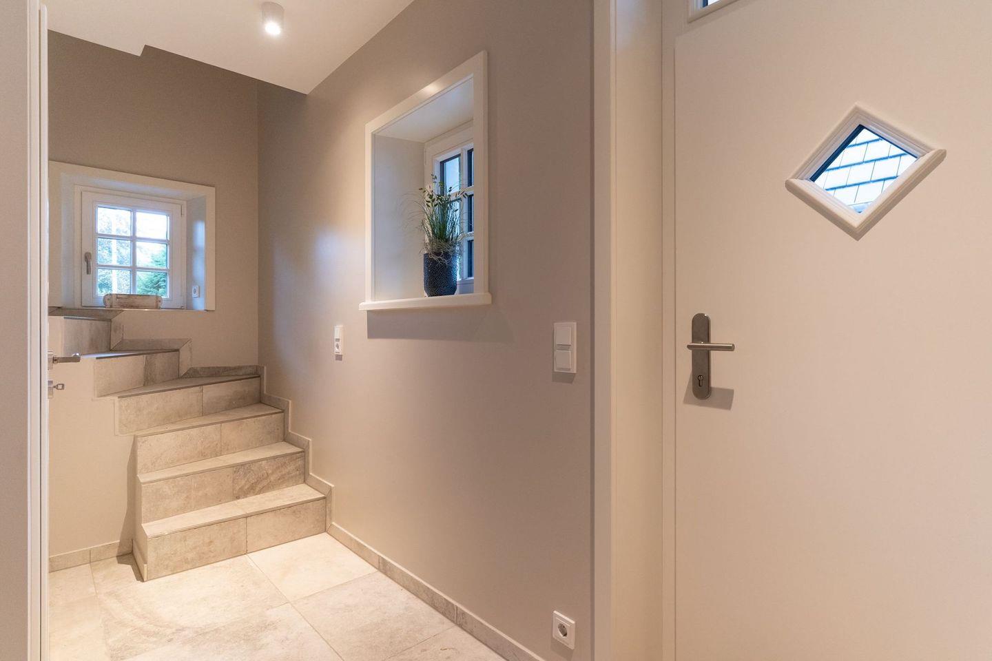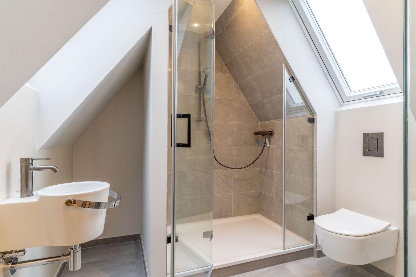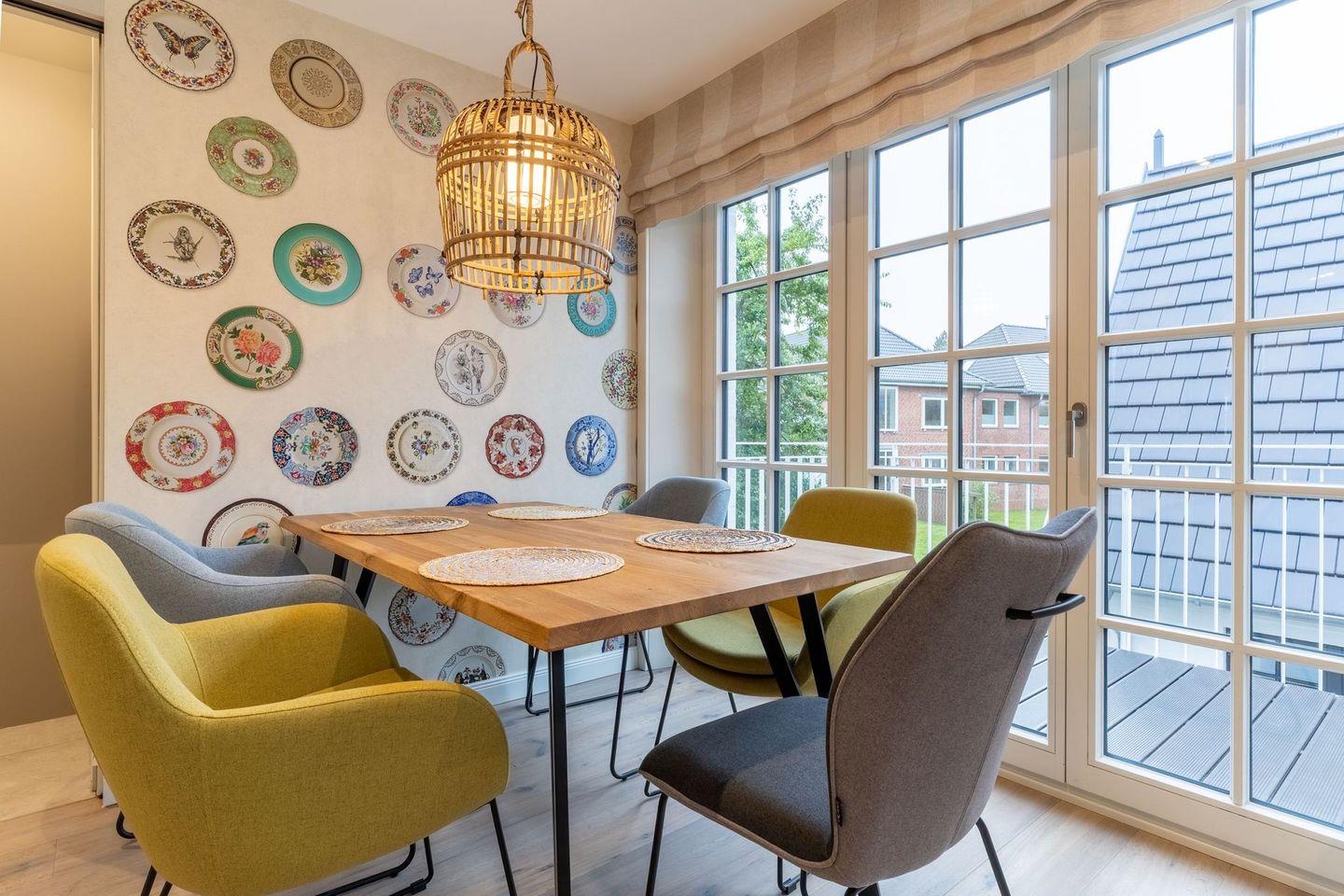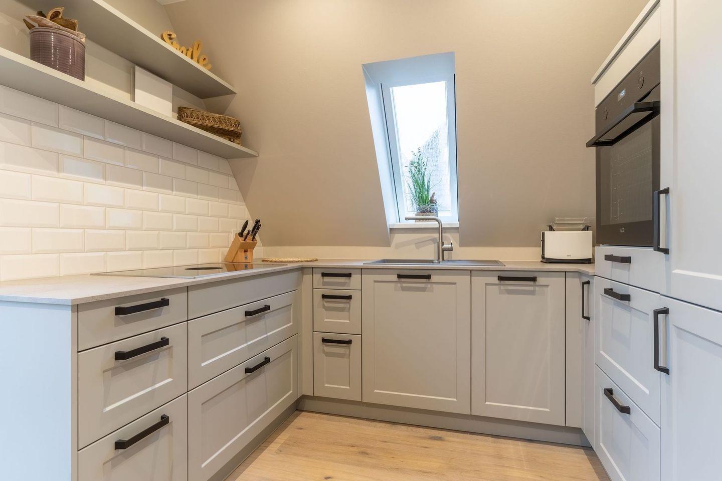 In der ersten Etage im Obergeschoss, welches Sie über einen separaten Hauseingang erreichen, befindet sich der lichtdurchflutete Wohnraum mit TV, Gaskamin, einer offenen Küche sowie einem stilvollen Essbereich mit Balkonzugang. Die Küche ist mit hochwertigen Elektrogeräten ausgestattet und bildet mit seinem angrenzenden Wohnraum das Herzstück des Appartements. Die Wohn- und Schlafräume sind mit exklusiven Möbeln und Parkettboden ausgestattet.