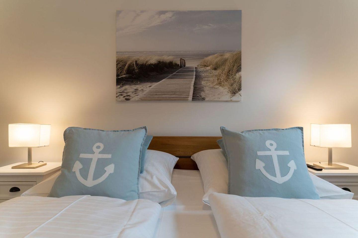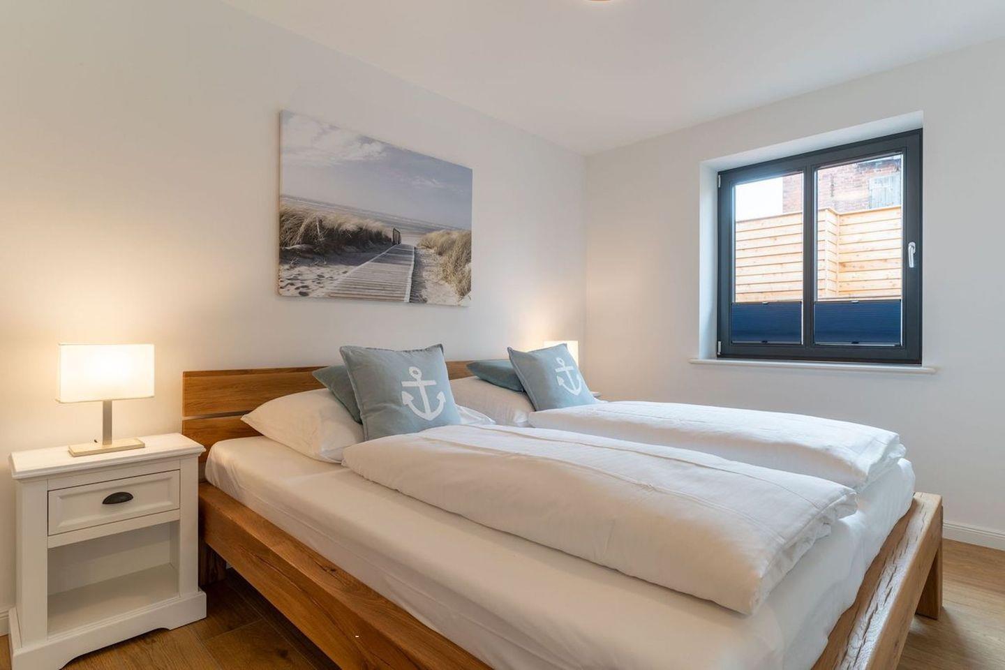 Vom Flur gelangen Sie ins Doppelschlafzimmer mit TV. Zusätzlich gibt es im Wohnzimmer ein gemütliches Schlafsofa für eine Personen. Das Duschbad bietet genügend Platz für Ihre Utensilien.