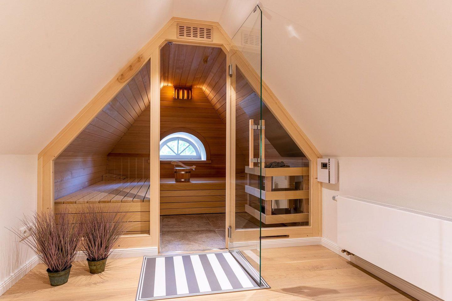 Das volle Wohlfühlprogramm erwartet Sie im Dachgeschoss, hier gelangen Sie direkt in die Sauna.