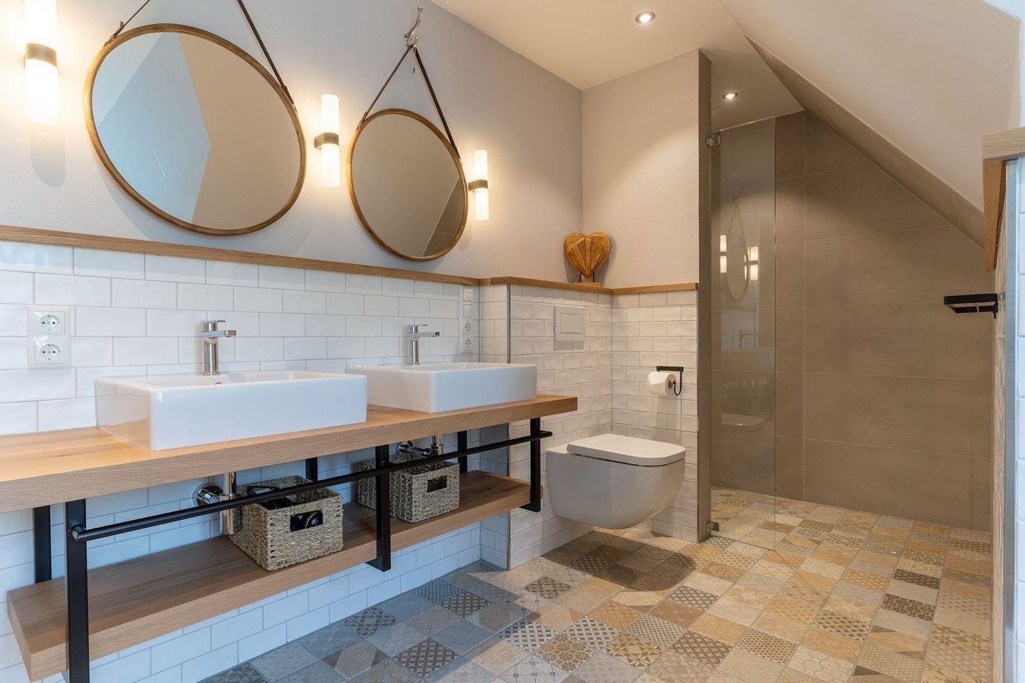 Ein zweites vollausgestattetes Badezimmer im OG, mit einer Dusche und zwei einzelnen Waschbecken runden das hochwertige Hauskonzept ab und lassen keine Wünsche offen.