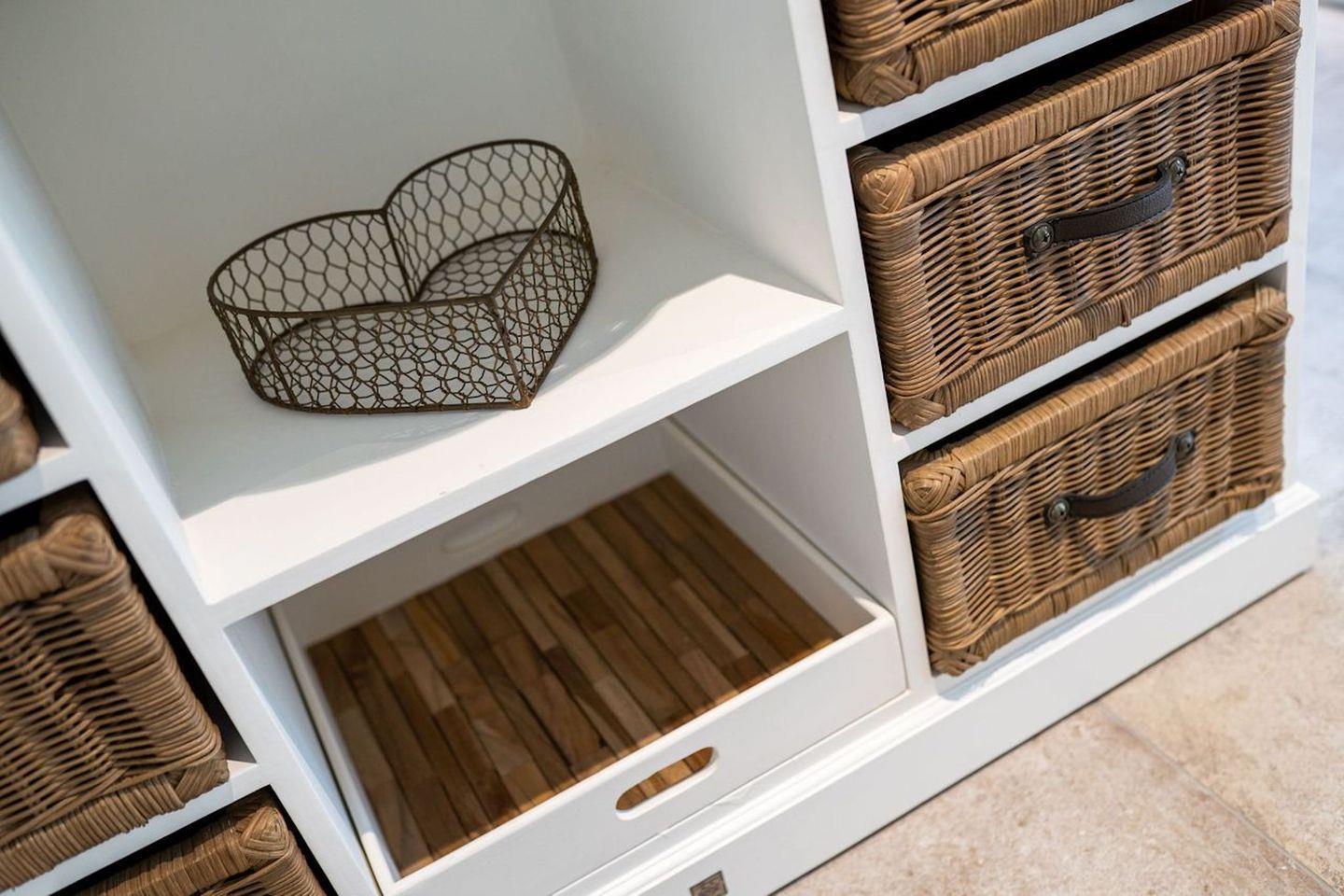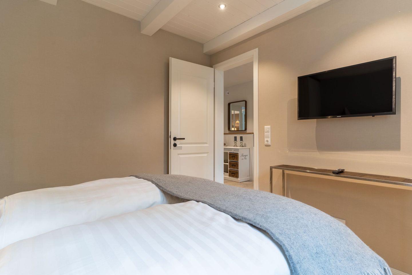 An den Wohnbereich schließen sich ein Flur, ein Schlafzimmer mit einem Doppelbett und TV sowie ein Bad und ein Abstellraum.
