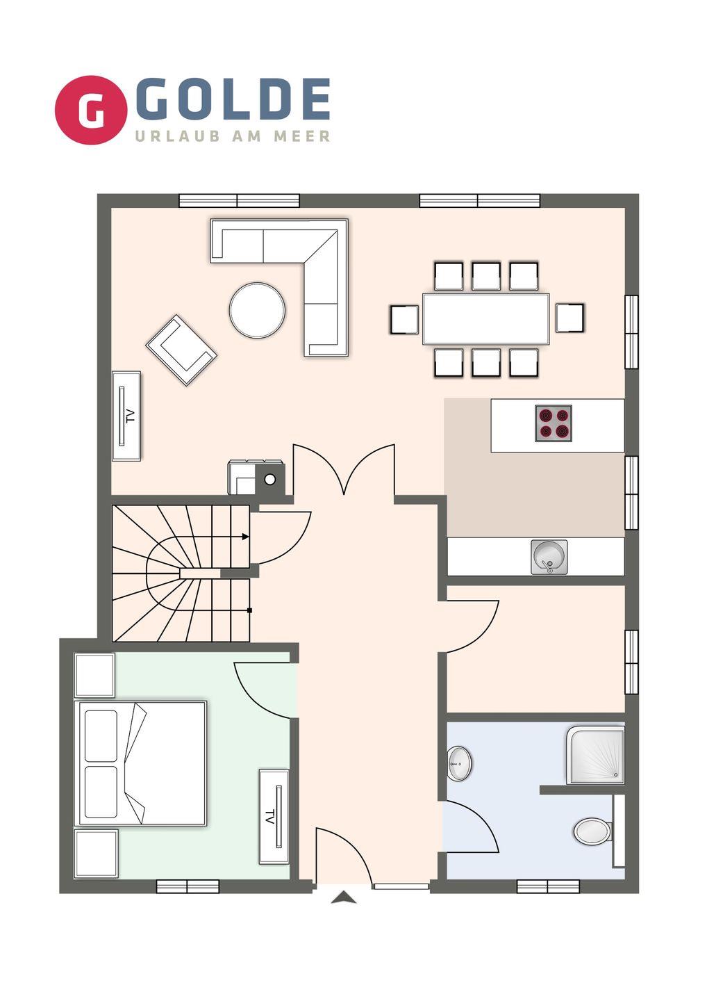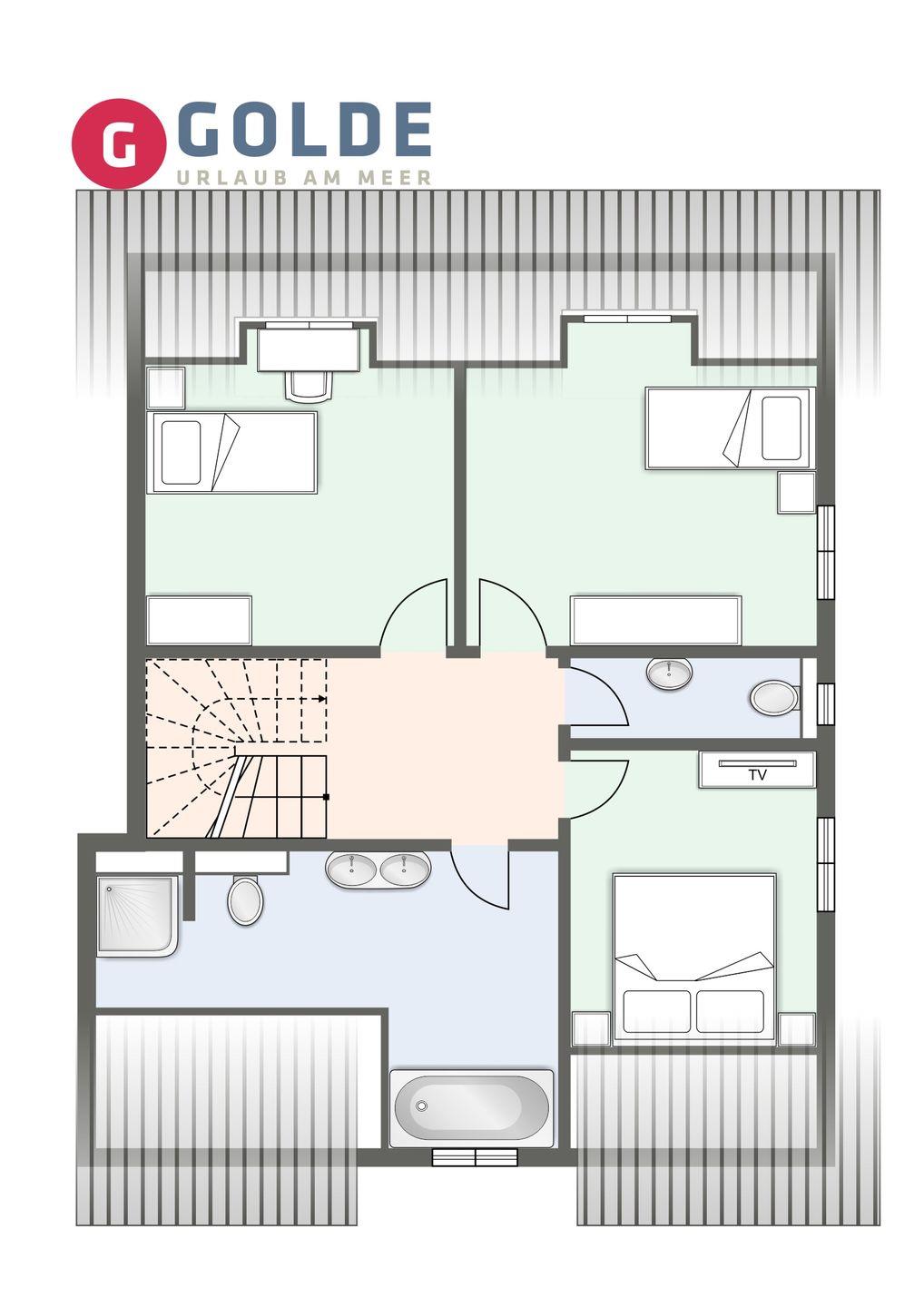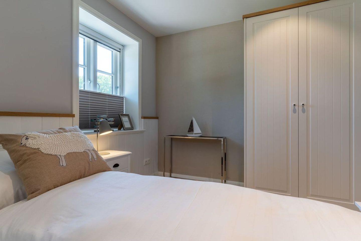 Über eine Holztreppe gelangt man in das Obergeschoss. Ein weiteres Schlafzimmer mit einem Doppelbett ist ebenfalls mit TV ausgestattet. Kleiderschränke gewähren Ihnen hinreichend Ablageflächen.