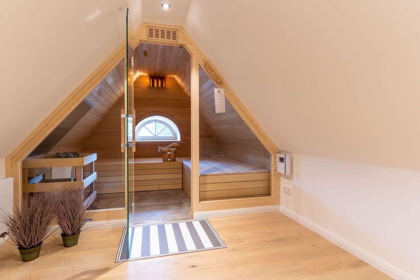 Das volle Wohlfühlprogramm erwartet Sie im Dachgeschoss, hier gelangen Sie direkt in die Sauna.