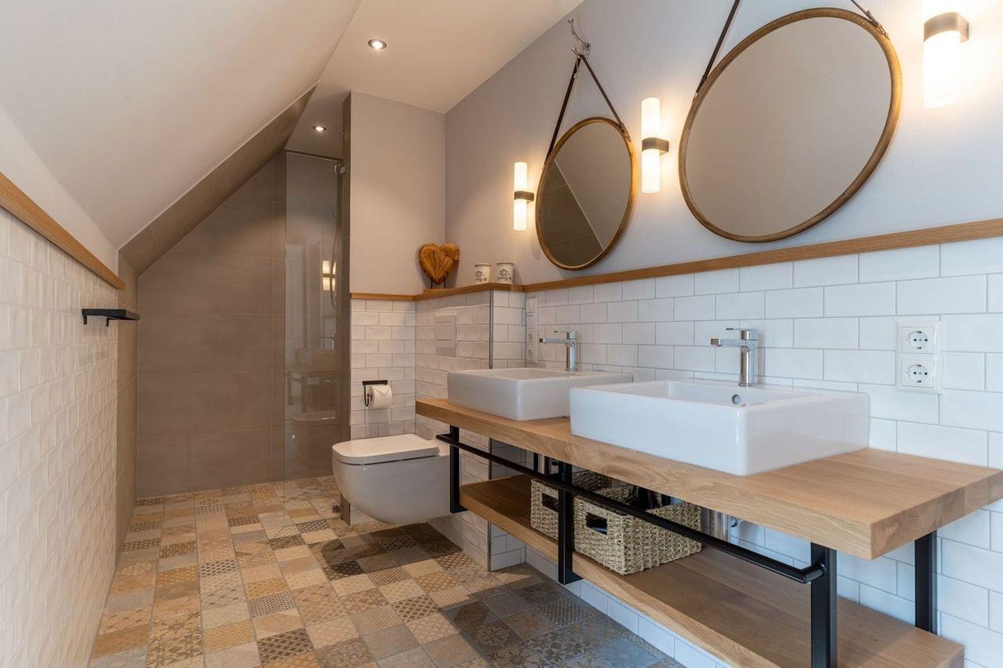 Ein zweites vollausgestattetes Badezimmer im OG, mit einer Dusche und zwei einzelnen Waschbecken runden das hochwertige Hauskonzept ab und lassen keine Wünsche offen.