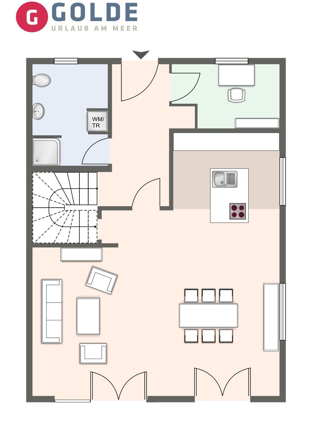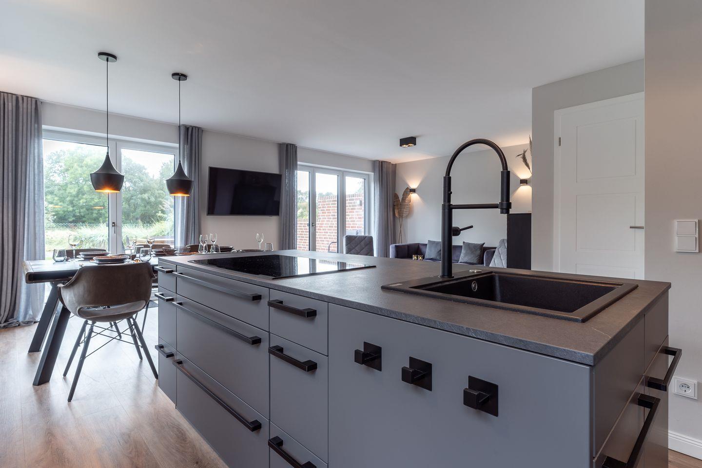 Im Erdgeschoss erwartet Sie ein lichtdurchfluteter Wohnraum mit einem Fernseher, einer großzügigen offenen Küche und einem gemütlichen Essbereich. Besonders hervorzuheben ist die gemütliche Sitzbank direkt am Fenster im Wohnbereich, die sicherlich zu einem Ihrer Lieblingsplätze im Haus wird - perfekt zum Lesen eines guten Buches oder zum Genießen des ersten Morgenkaffees.