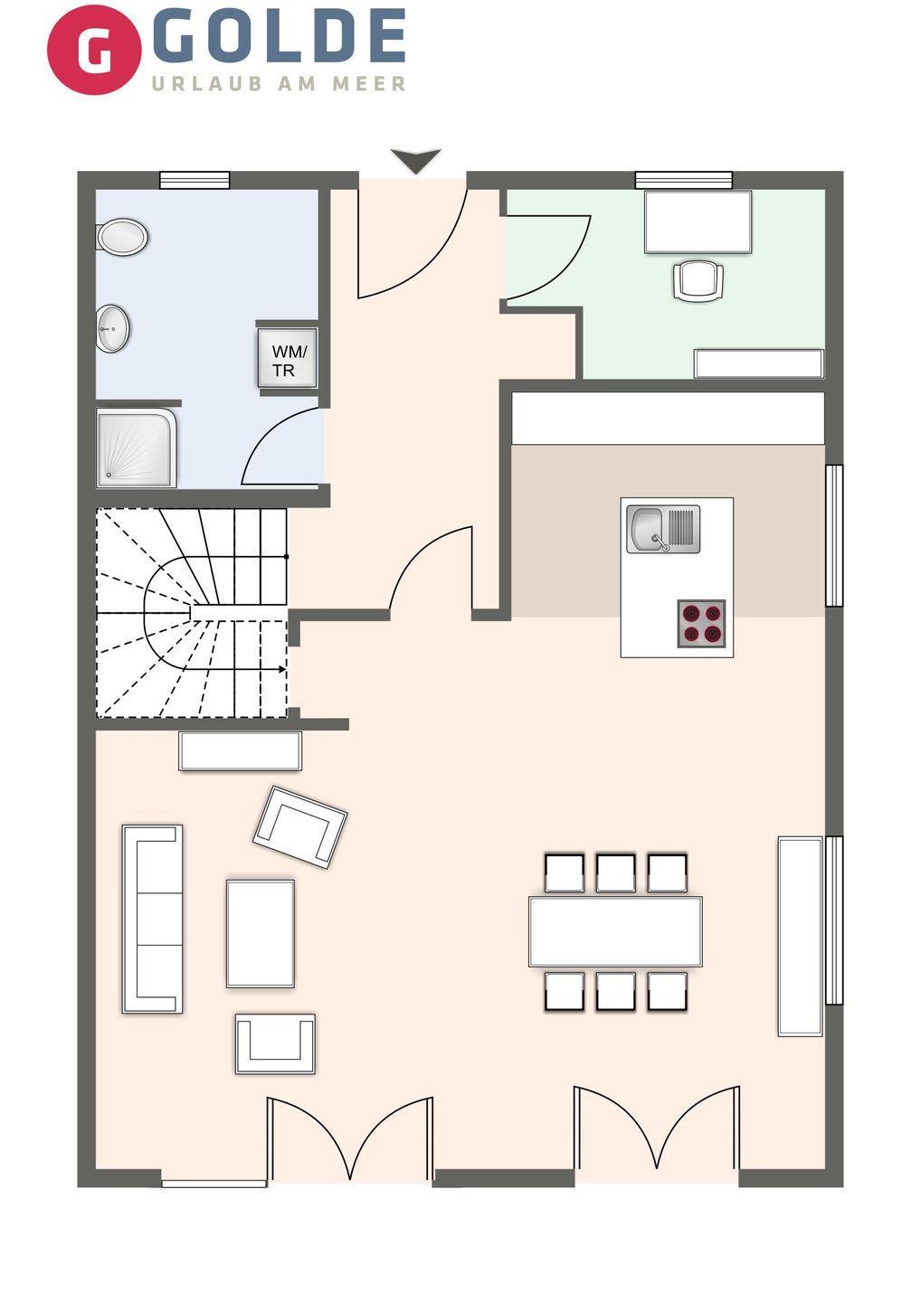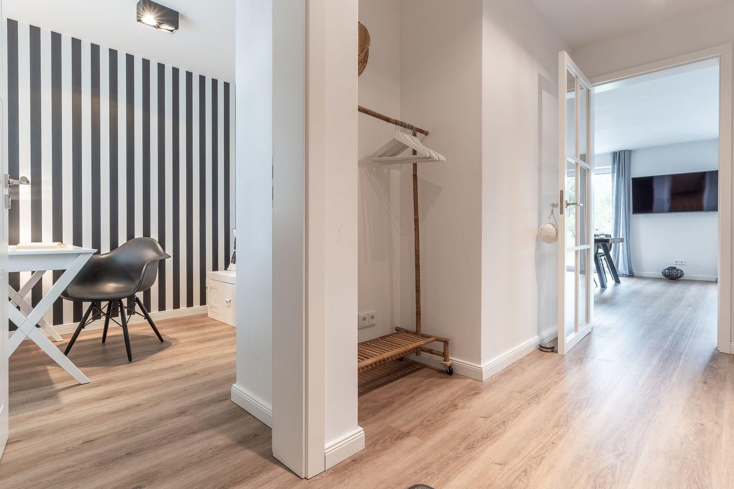 Die Küche ist mit hochwertigen Elektrogeräten ausgestattet und bietet ausreichend Platz für gemeinsame Kochsessions. Vom Flur mit einer geräumigen Garderobe, ideal für Jacken und Schuhe, gelangen Sie in ein Duschbad. Zusätzlich bietet das Erdgeschoss einen separaten Raum für Workcations.