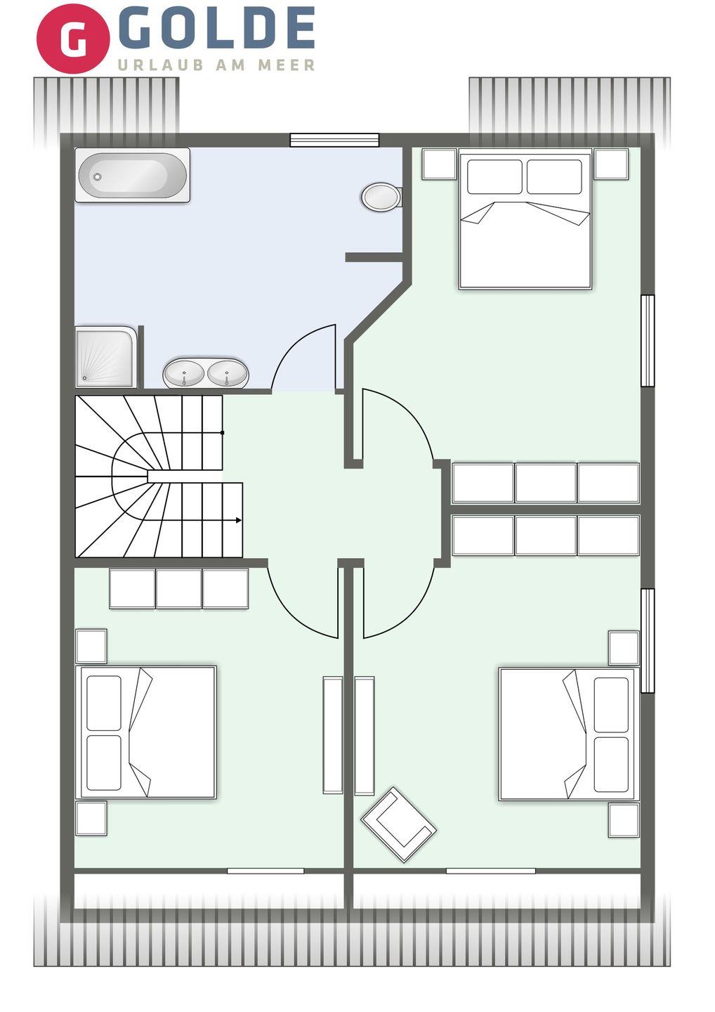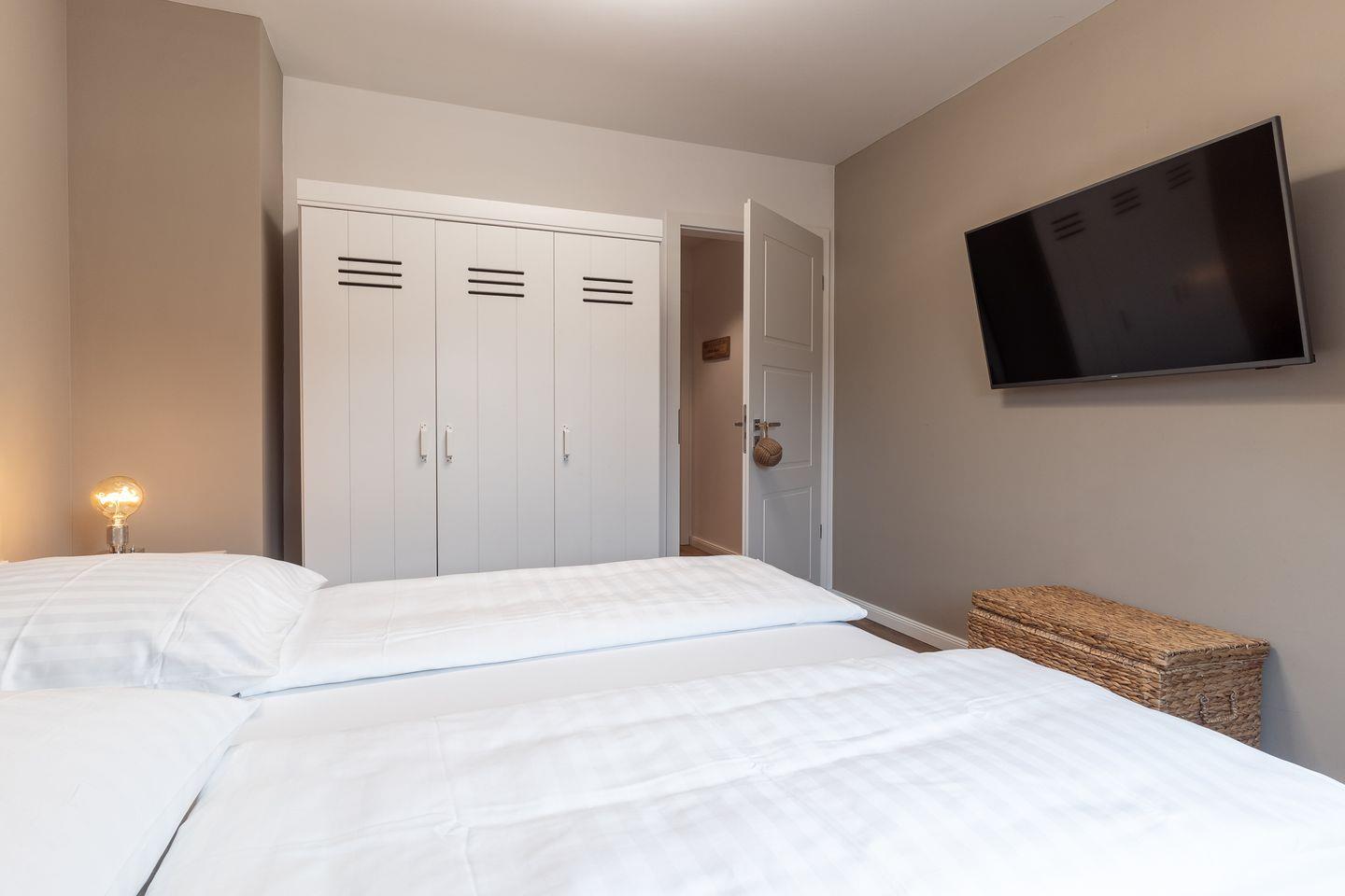 Über eine Treppe gelangen Sie ins Obergeschoss. Hier erwarten Sie drei Schlafzimmer, jeweils mit einem Boxspring-Doppelbett, ausgestattet mit Fernseher und großen Kleiderschränken.
