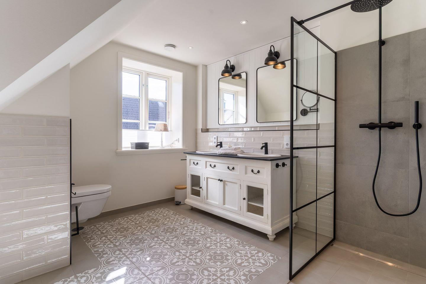 Das vollausgestattete Badezimmer im OG, hat eine Dusche, ein WC und einen großzügigen Doppelwaschtisch. Ein Highlight ist die integrierte Sauna, die das hochwertige Hauskonzept abrundet und keine Wünsche offen lässt.