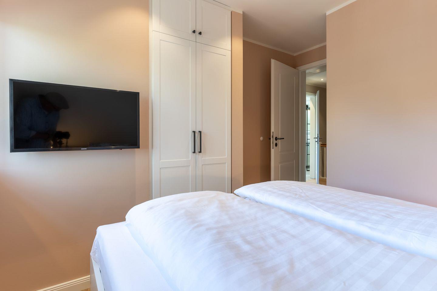 Über eine schöne Holztreppe gelangt man in das Obergeschoss, in dem sich 3 liebevoll eingerichtete Schlafzimmer sowie 2 Bäder mit einer kleinen Sauna befinden. Das Master-Schlafzimmer verfügt über ein Doppelbett, einen TV, einen großen Kleiderschrank sowie ein eigenes kleines Bad en suite. Die 2 anderen Schlafzimmer sind ebenfalls mit TV und einem Kleiderschrank ausgestattet.
