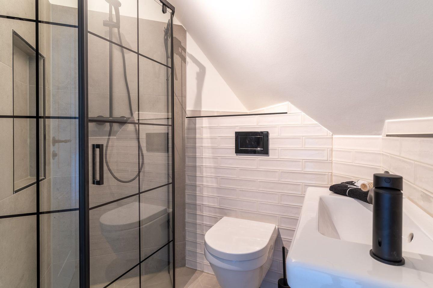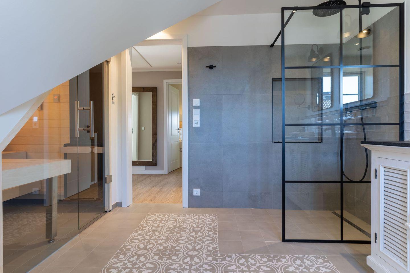 Das vollausgestattete Badezimmer im OG, hat eine Dusche, ein WC und einen großzügigen Doppelwaschtisch. Ein Highlight ist die integrierte Sauna, die das hochwertige Hauskonzept abrundet und keine Wünsche offen lässt.
