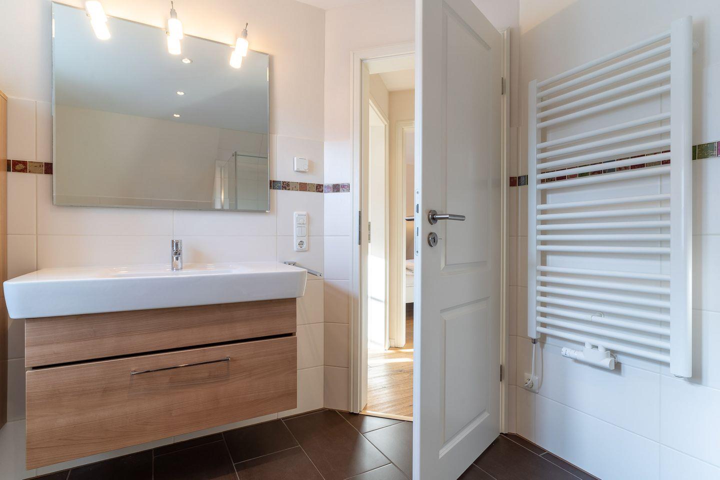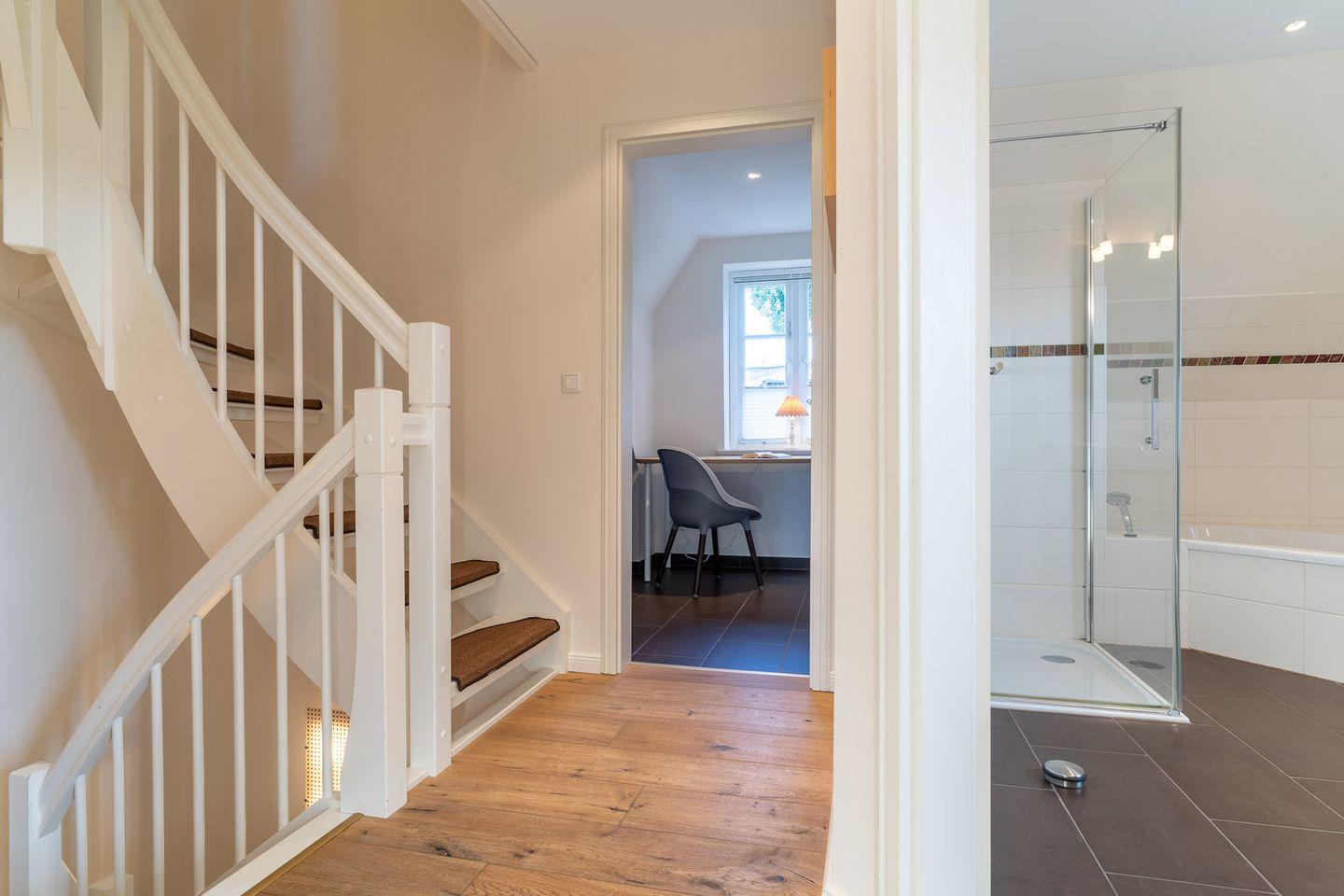 Darüber hinaus befindet sich im Obergeschoss ein weiteres, geräumiges Bad mit Dusche und einer Eckbadewanne.