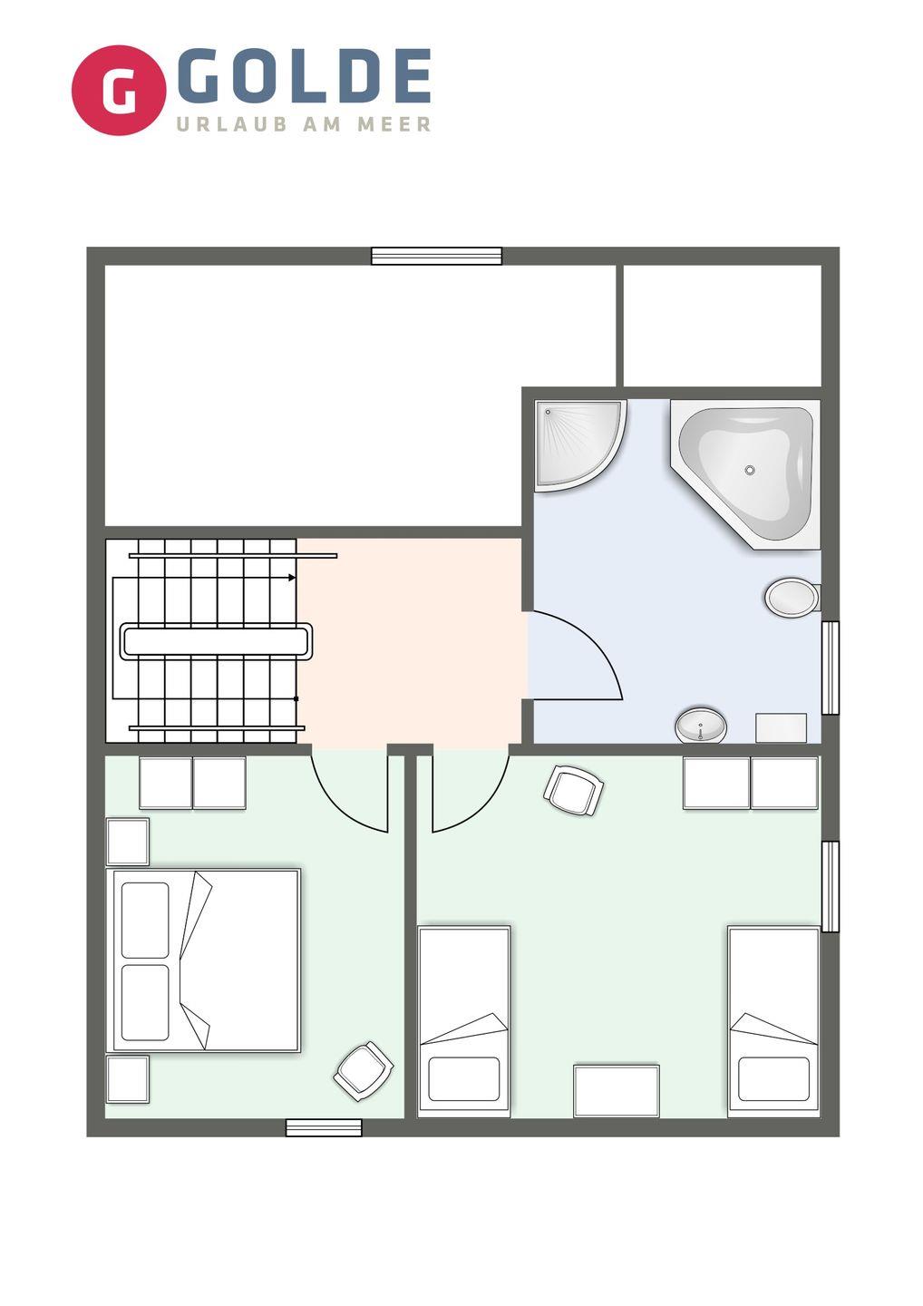 Über eine Holztreppe gelangen Sie in das Obergeschoss mit zwei großzügigen Schlafzimmern, ein Doppelschlafzimmer und ein Schlafzimmer mit zwei Einzelbetten. Die Schlafzimmer sind mit geräumigen Schränken ausgestattet, in einem finden Sie zudem einen Schreibtisch an dem es sich prima von Zuhause aus arbeiten lässt.