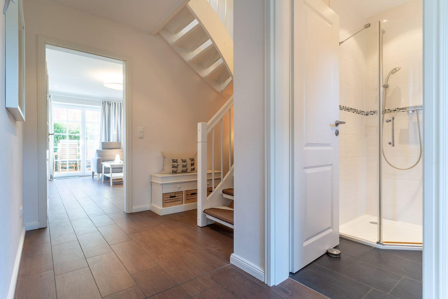 Im Erdgeschoss befindet sich der lichtdurchflutete Wohnraum mit TV, Kamin, einer offenen Küche sowie einem stilvollen Essbereich. Die Küche verfügt über hochwertige Elektrogeräte. An den Wohnbereich schließen sich ein Flur, ein Duschbad und ein Abstellraum.