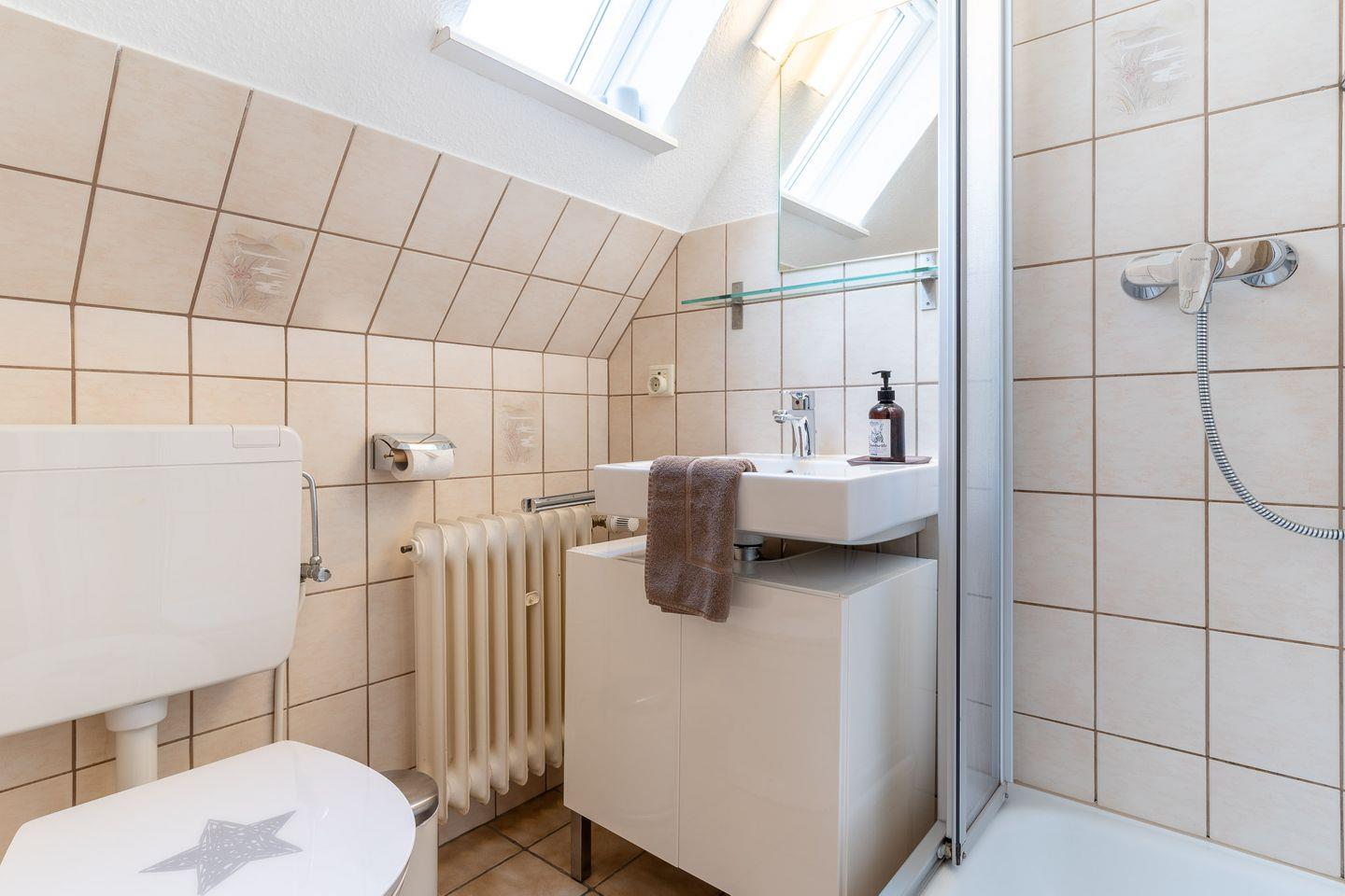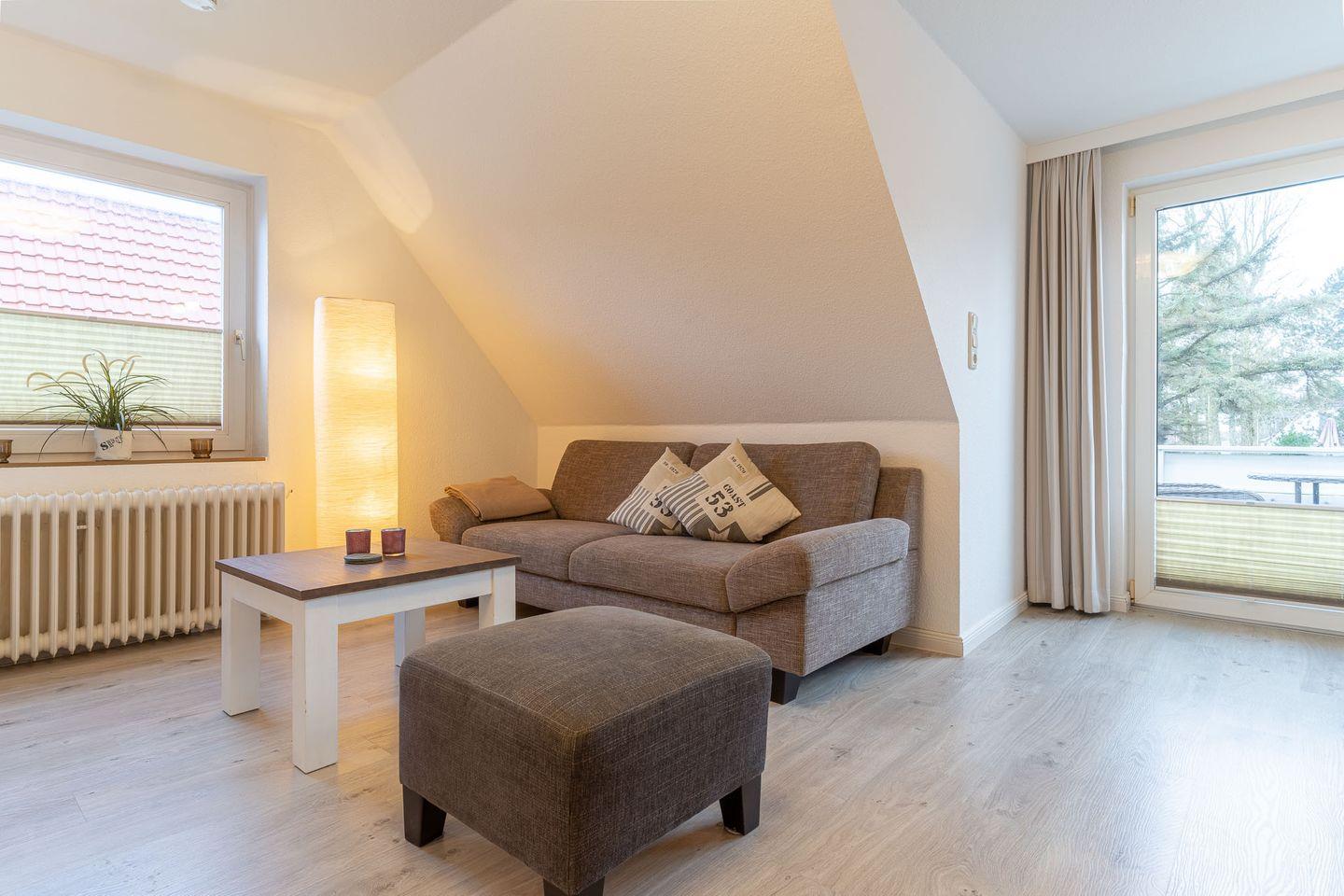 Das Schlafzimmer ist mit einem bequemen Doppelbett (200 x 160 cm) ausgestattet und sorgt für einen erholsamen Schlaf. Die Fenster sind mit Plissees verdunkelt. Das Tageslicht-Duschbad mit WC ist funktional eingerichtet. Auf dem nach Süden ausgerichteten Balkon oder im Garten mit Strandkorb können Sie die Sonne und frische Luft genießen.