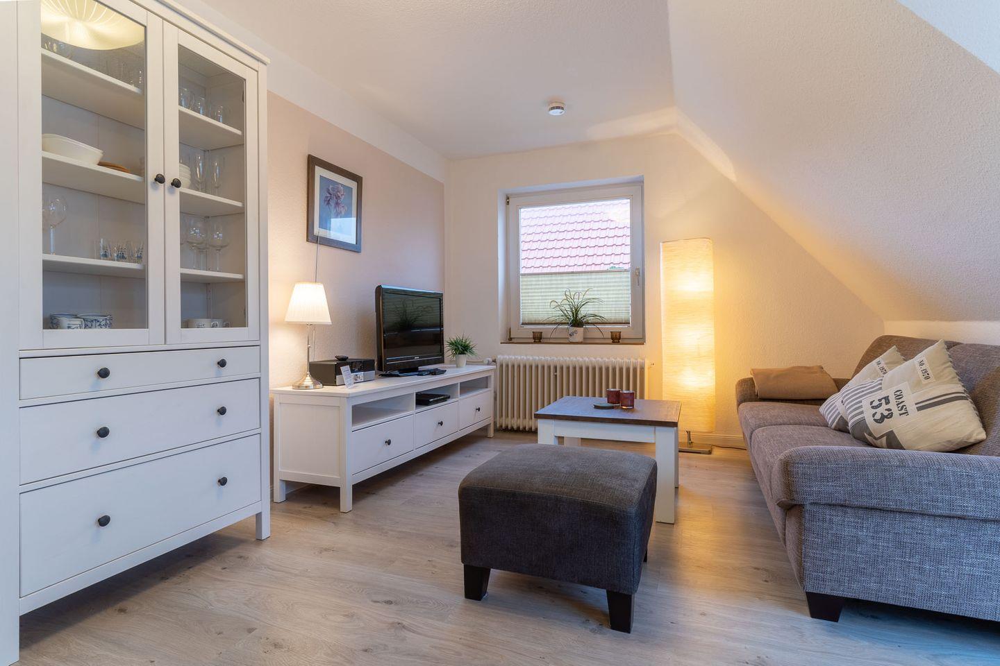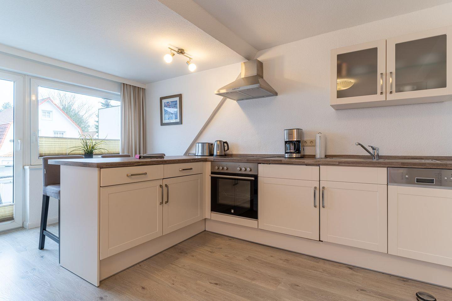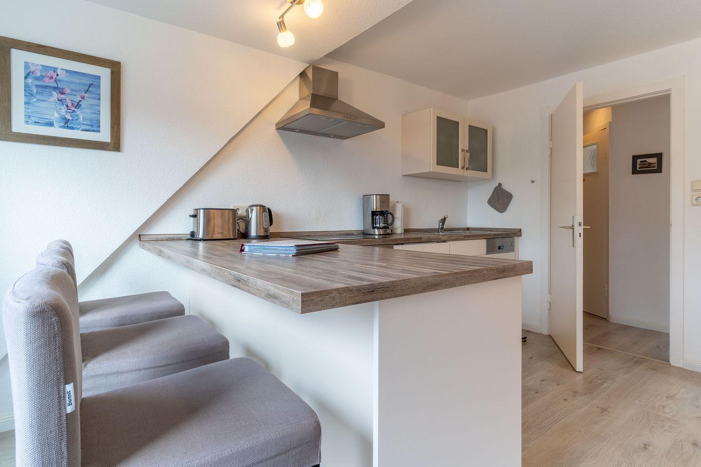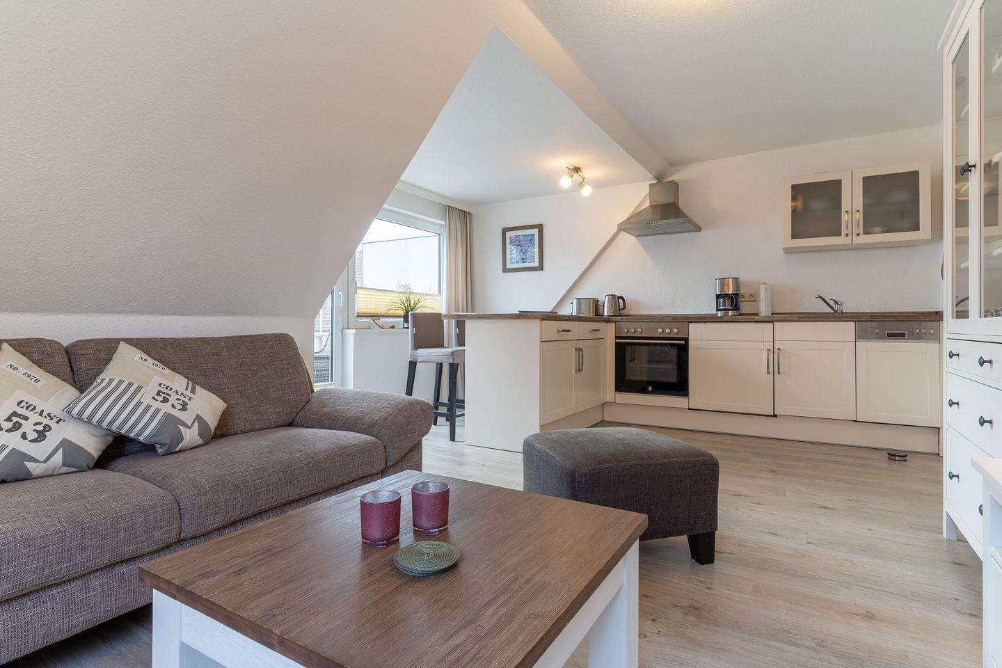 Willkommen in der gemütlichen Ferienwohnung "Springfloot 2"! Diese charmante Wohnung im Obergeschoss des Hauses ist perfekt für Paare und bietet auf 40 Quadratmetern Platz für zwei Personen. Das Wohnzimmer ist sehr gemütlich eingerichtet mit einer bequemen Couch und einem Flachbildfernseher. Die im Wohnbereich integrierte Einbauküche wurde komplett ausgestattet und erneuert im Jahr 2023. Sie verfügt über ein Ceranfeld, Backofen, Geschirrspülmaschine, Wasserkocher, Kaffeemaschine, Toaster, Eierkocher, Kühlschrank mit Gefrierfach und alle nötigen Utensilien, um leckere Mahlzeiten zuzubereiten. Der Küchentresen lädt zum gemeinsamen Kochen und Genießen ein.