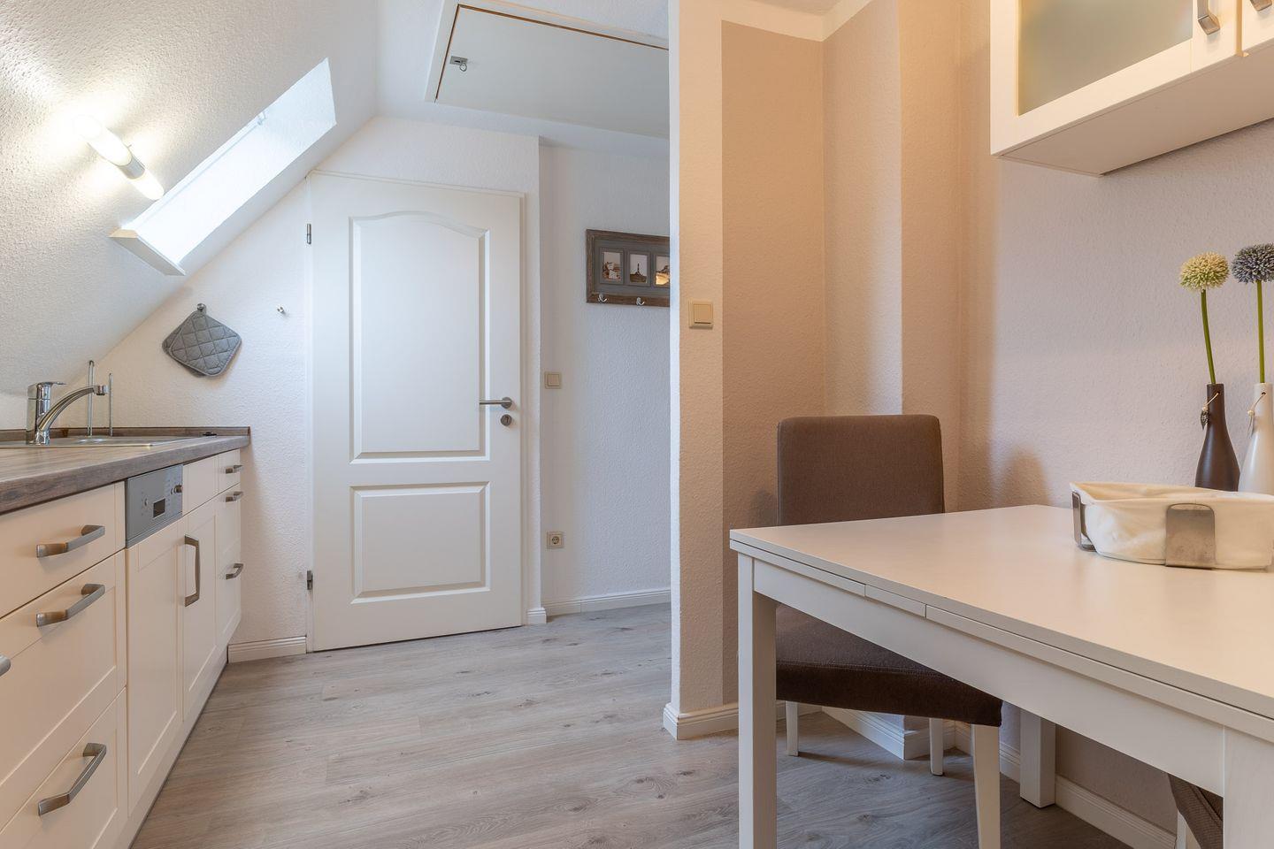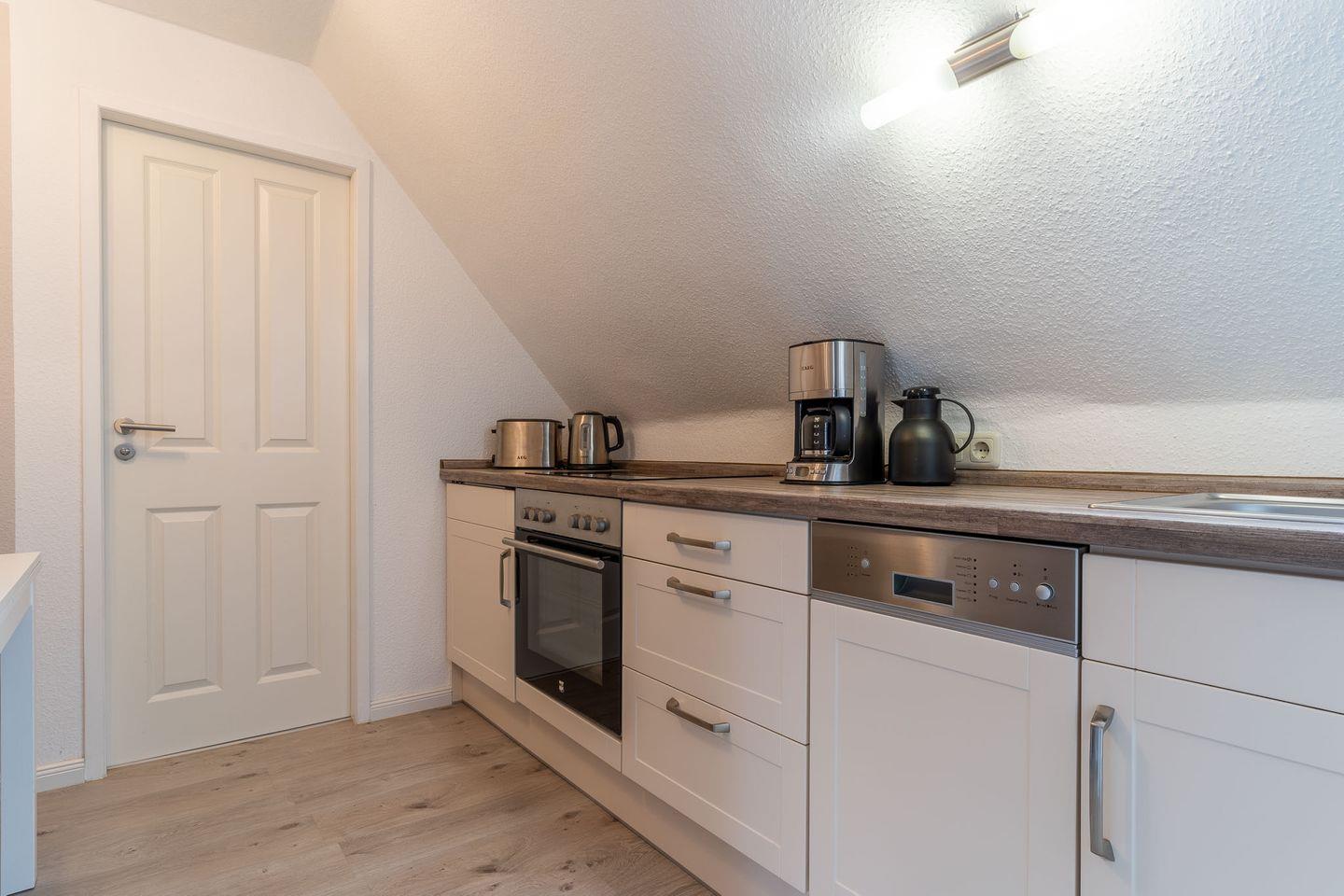 Die Wohnung „Springfloot 3“ (ca. 35 qm) liegt im Obergeschoss des Hauses und ist für bis zu zwei Personen geeignet. Das Wohnzimmer ist sehr gemütlich mit einer bequemen und großen Couch ausgestattet. Ein TV-Flachbildschirm gehört ebenso dazu wie eine Mini-Stereo-Anlage. Die Küche ist mit einem Ceranfeld, Geschirrspülmaschine, Wasserkocher, Kaffeemaschine, Toaster, Eierkocher, Kühlschrank mit Gefrierfach und allen nötigen Utensilien zum Herrichten leckerer Gerichte ausgestattet.