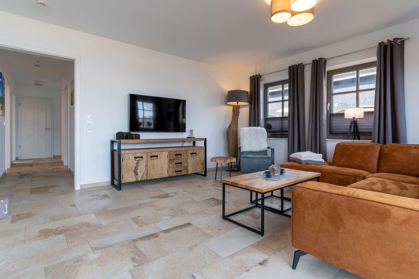 Der lichtdurchflutete Wohnraum mit TV, Sofalonge und einem gemütlichen Essbereich bietet jeden Komfort. Eine großzügige Terrasse lädt zum Sonnen ein.