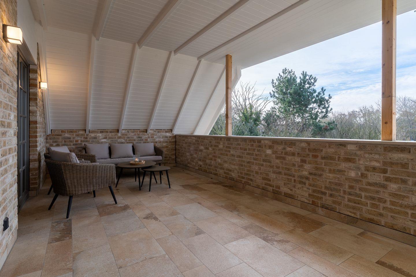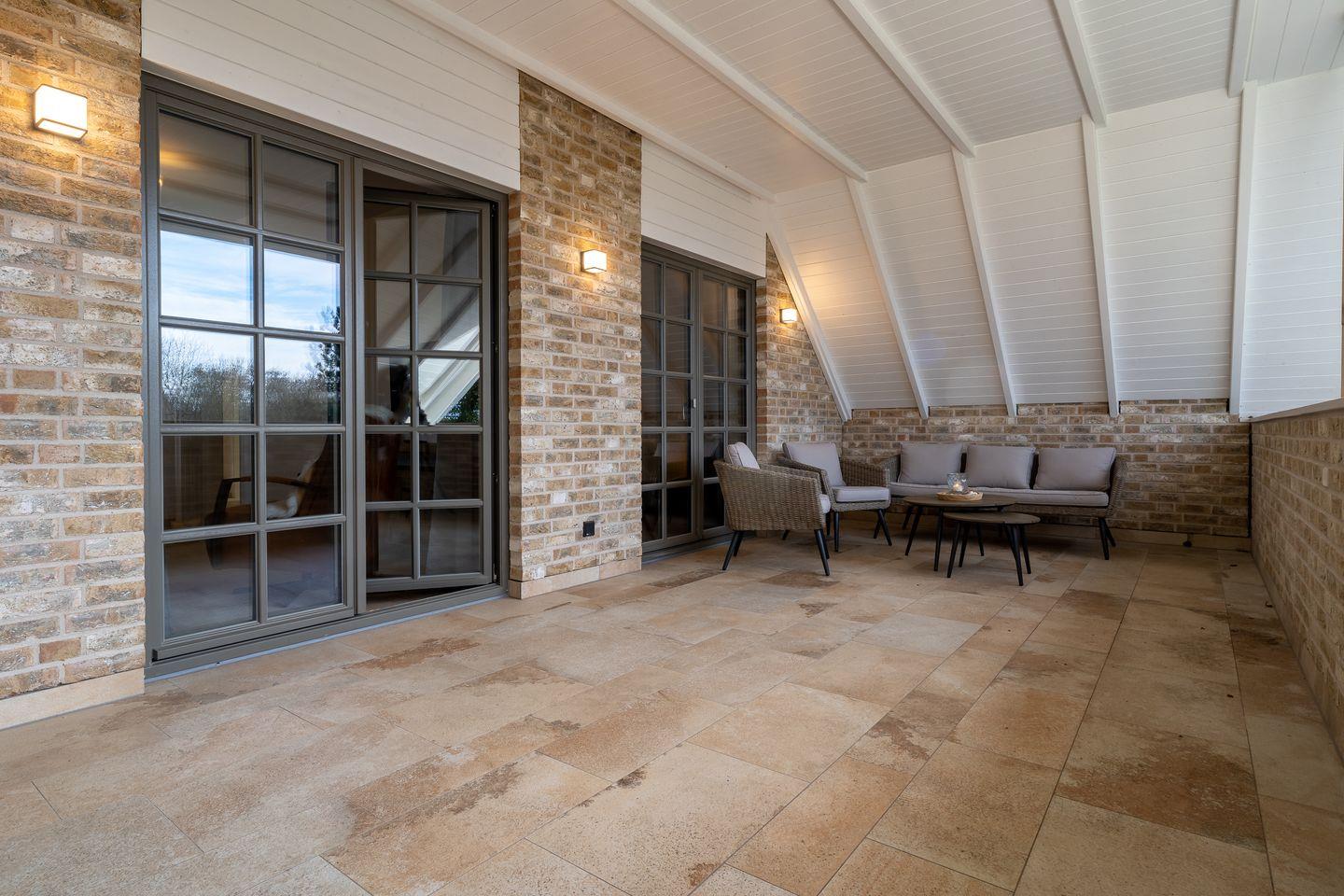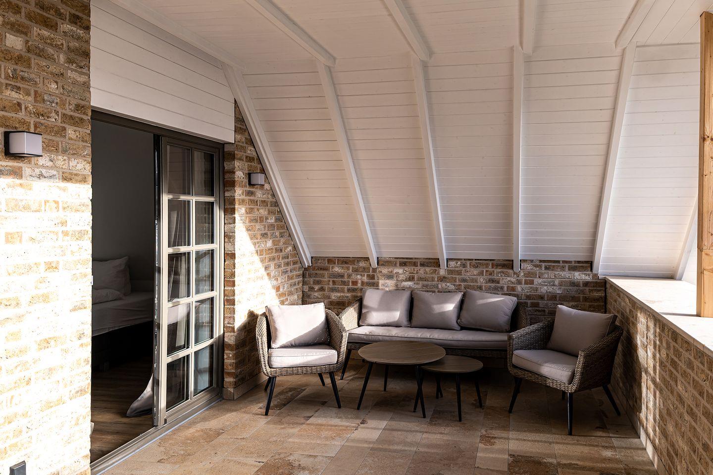 An dem Wohnzimmer schließt sich eine großzügige Balkonloggia. Diese erstreckt sich über die gesamte Seite des Hauses und bietet einen wunderbaren Ausblick.