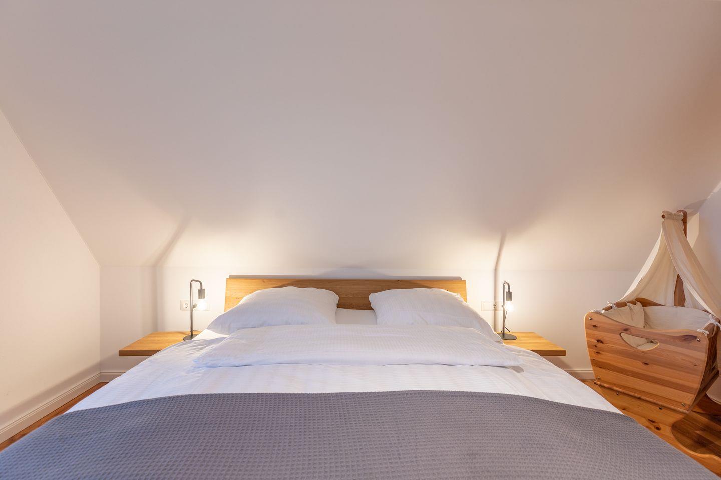 Das Schlafzimmer verwöhnt Sie mit einem hochwertigen Doppelbett (180×200), einem TV und ausreichend Kleiderschrankfläche. Ein Kinderbett mit Himmel steht bei Bedarf für Ihr Kleinkind bereit. Sie haben von hier aus und auch vom Wohnzimmer Zugang zum sonnigen Balkon mit Gartenmöbeln und einem Strandkorb. Zusätzlich steht Ihnen eine großzügige Terrasse mit Gasgrill im Erdgeschoss zur Verfügung.