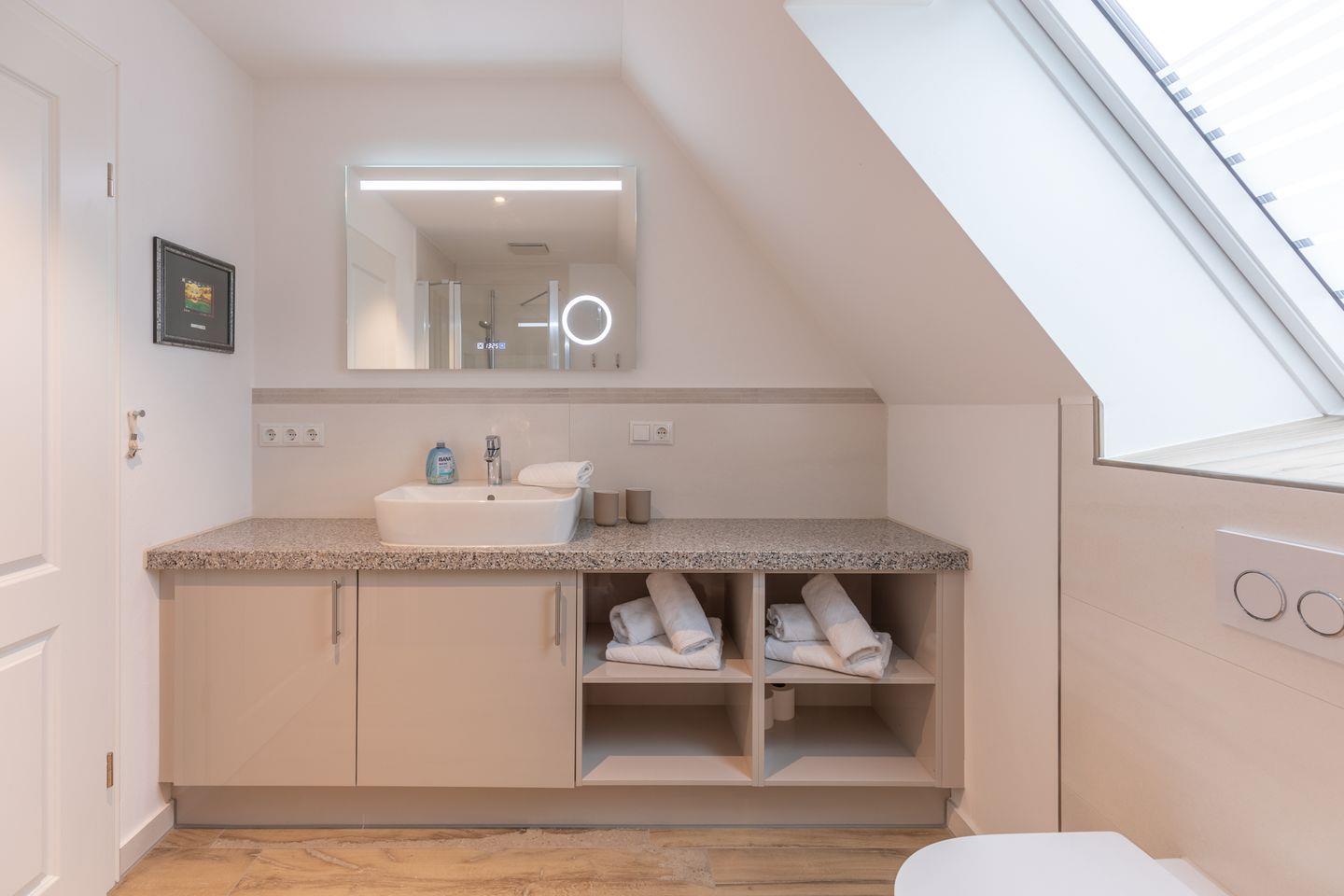 Das moderne Bad mit Fenster hat eine ebenerdige Dusche zu bieten. Waschmaschine und Trockner stehen Ihnen zur freien Verfügung im Flur 2. OG (…Tür neben der Treppe und der Klingel Moand).
