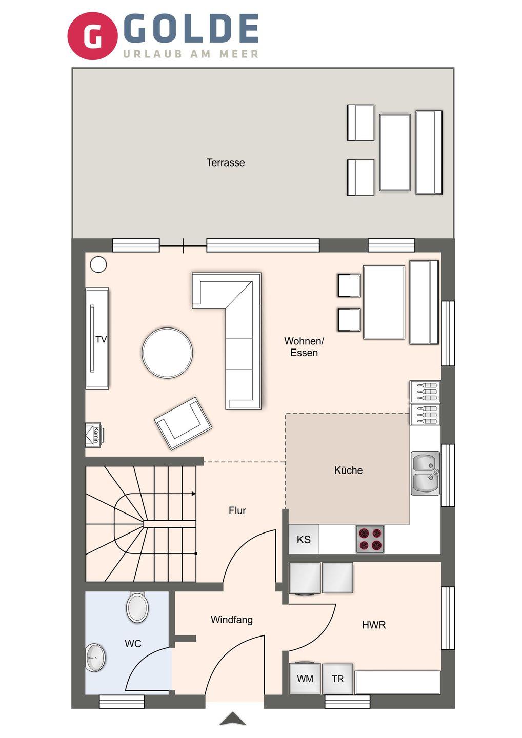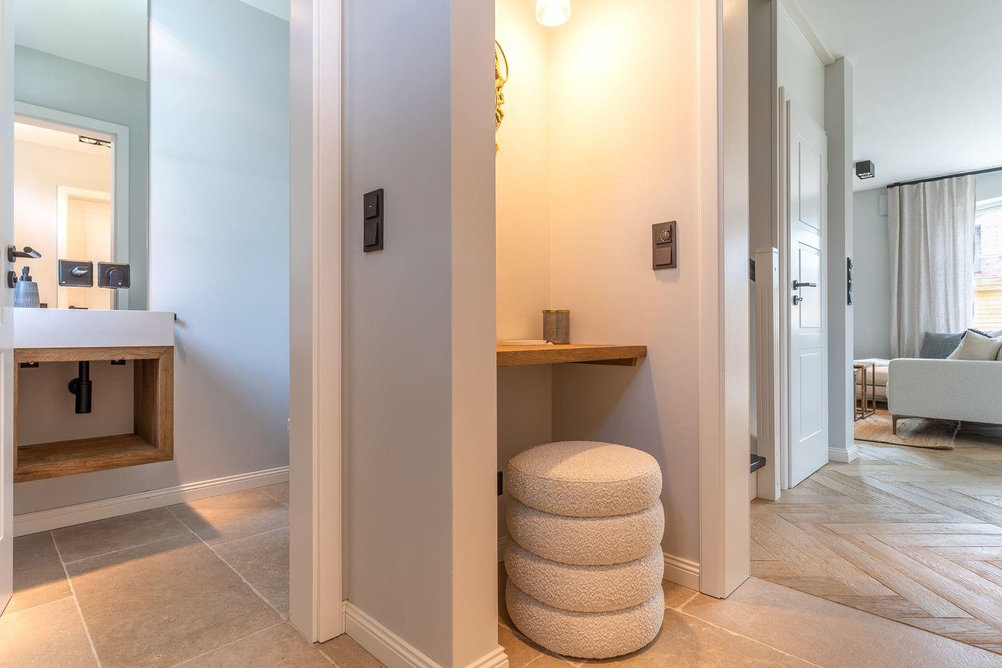 An den Wohnbereich schließen sich ein Flur, ein Gäste WC sowie ein Abstellraum an.