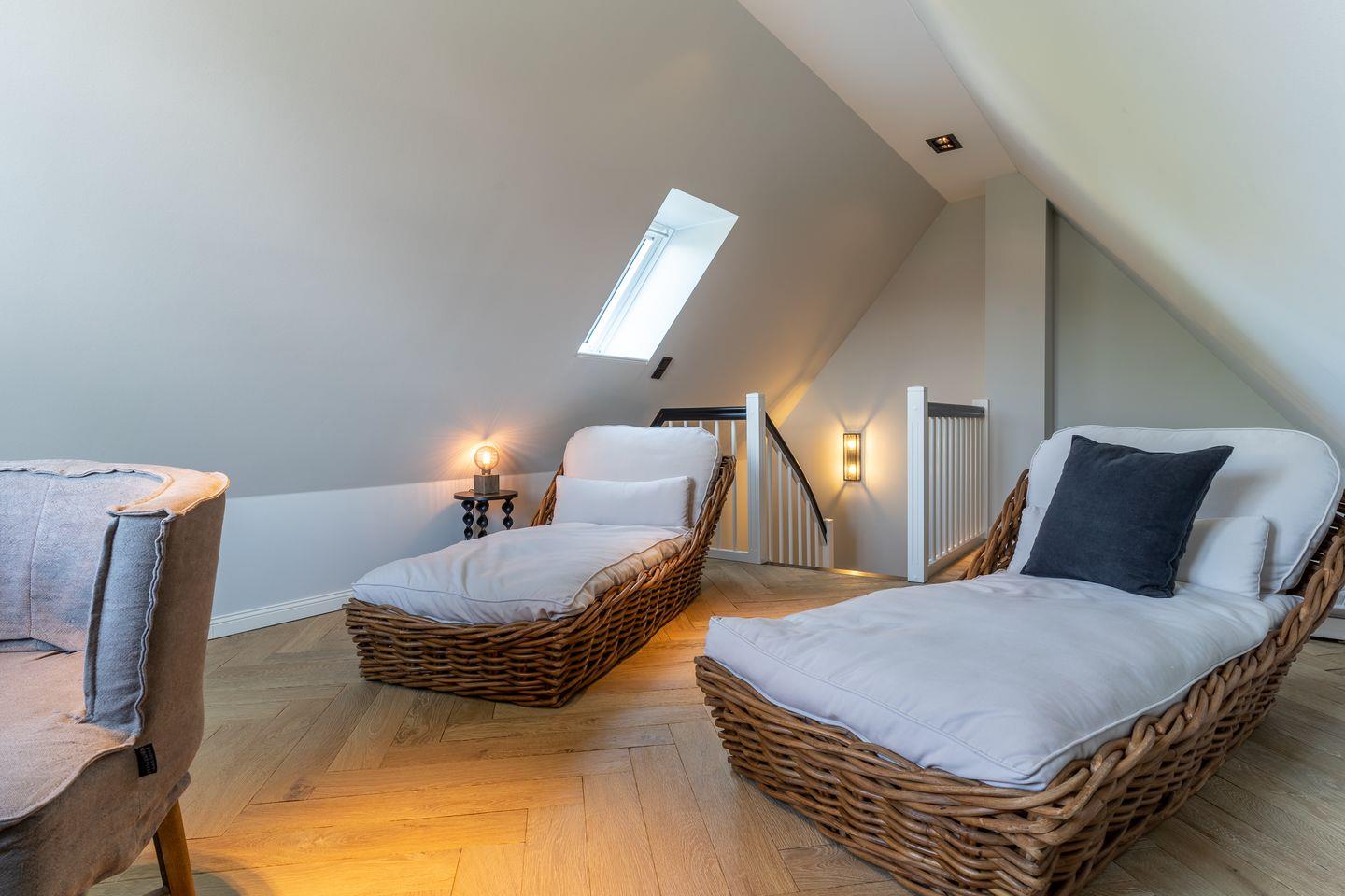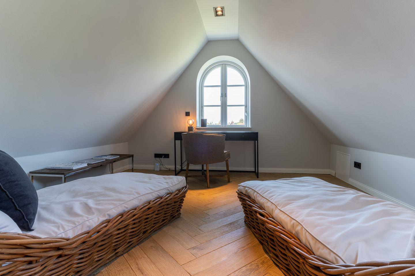 Über eine weitere Holztreppe geht es vom Flur ins Dachgeschoss. Hier finden Sie ein weiteres Zimmer mit einem ruhigem Arbeitsbereich und zwei gemütlichen Loungeliegen.