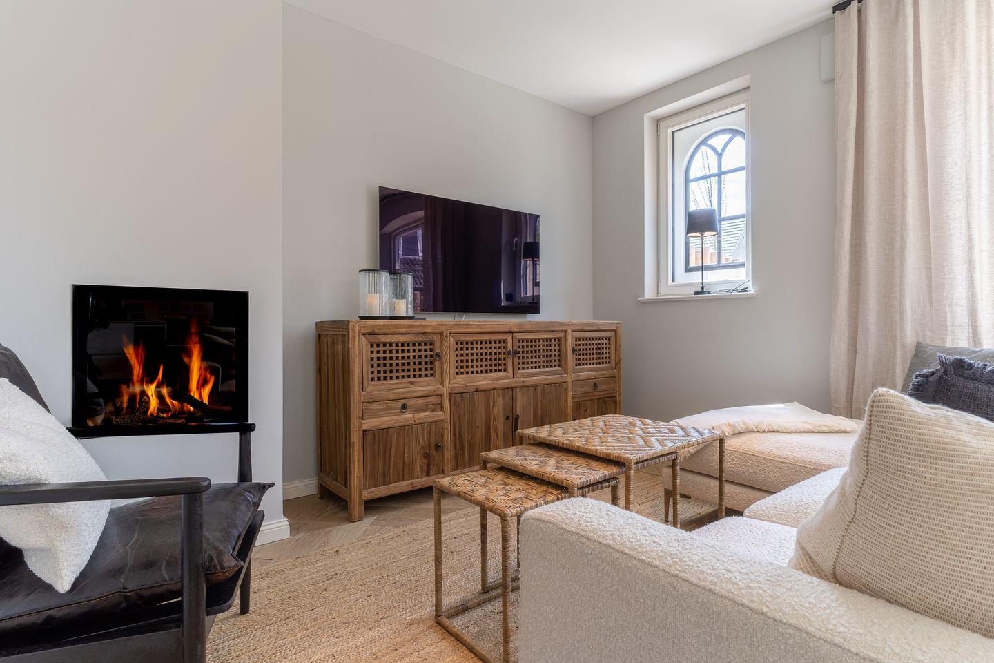 Im Erdgeschoss befindet sich ein großer, lichtdurchfluteter Wohnraum mit gemütlichem Essbereich, einer offenen Küche und Gaskamin.